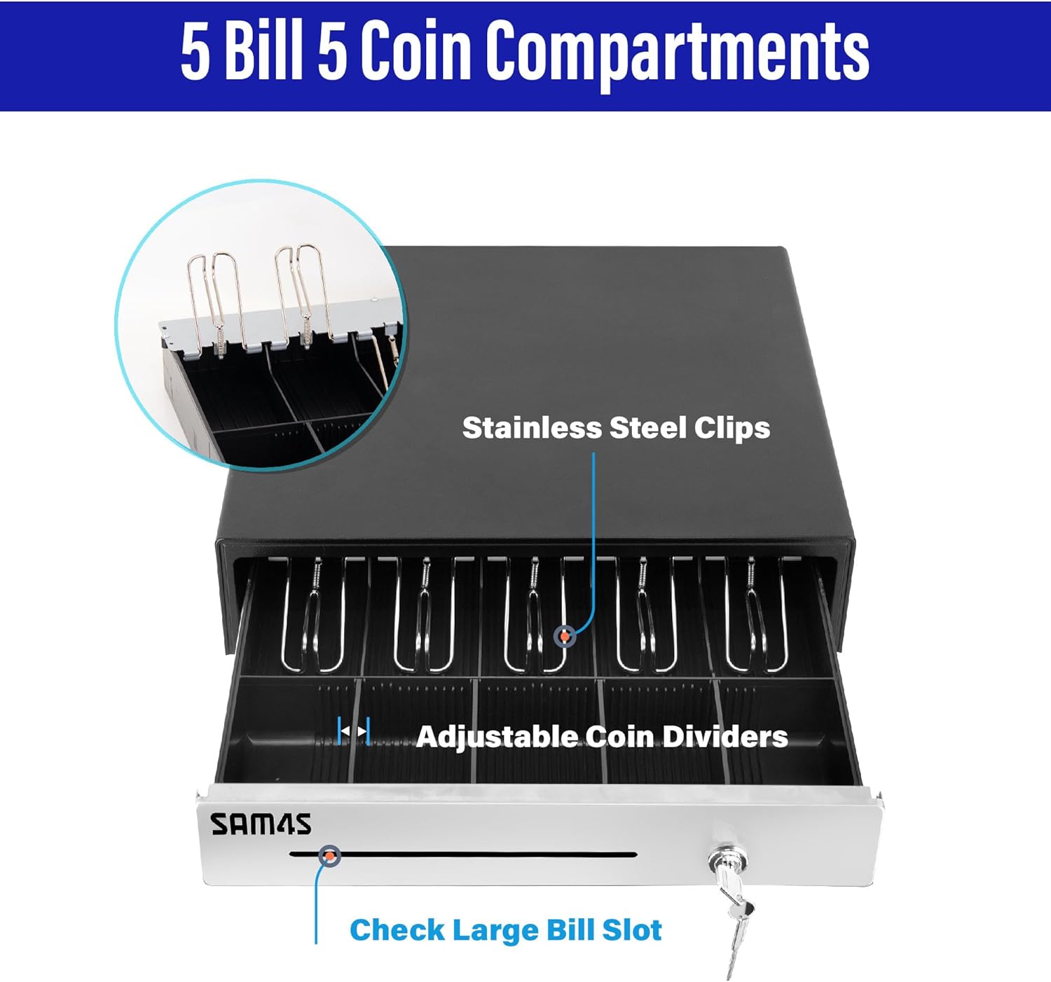 - 📏 Compact Design: Designed to fit snugly in small spaces while offering ample storage. It features a 5-Bill and 5-Coin till, allowing for organized cash management. Size: 16.25 x 16.75 x 4.25 inch (Width x Length x Height)