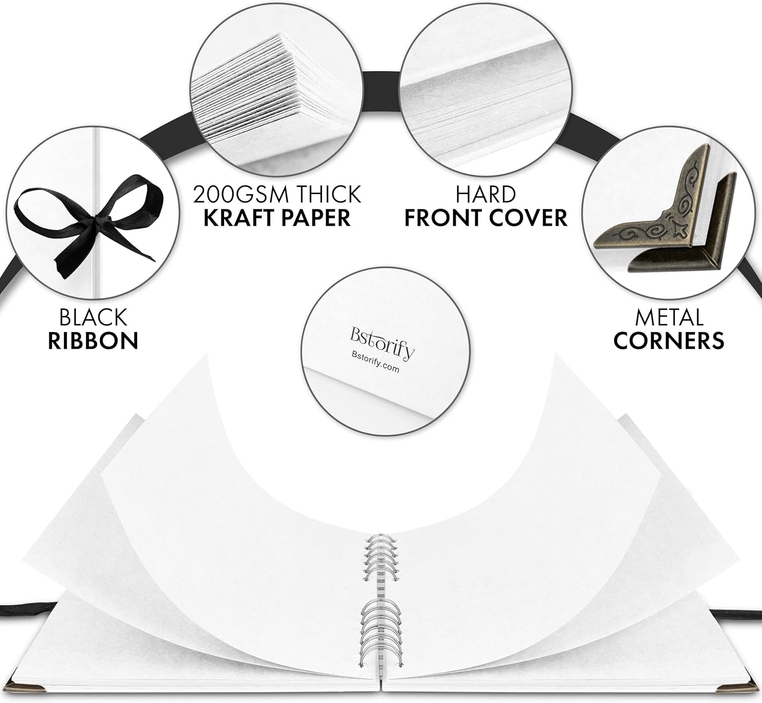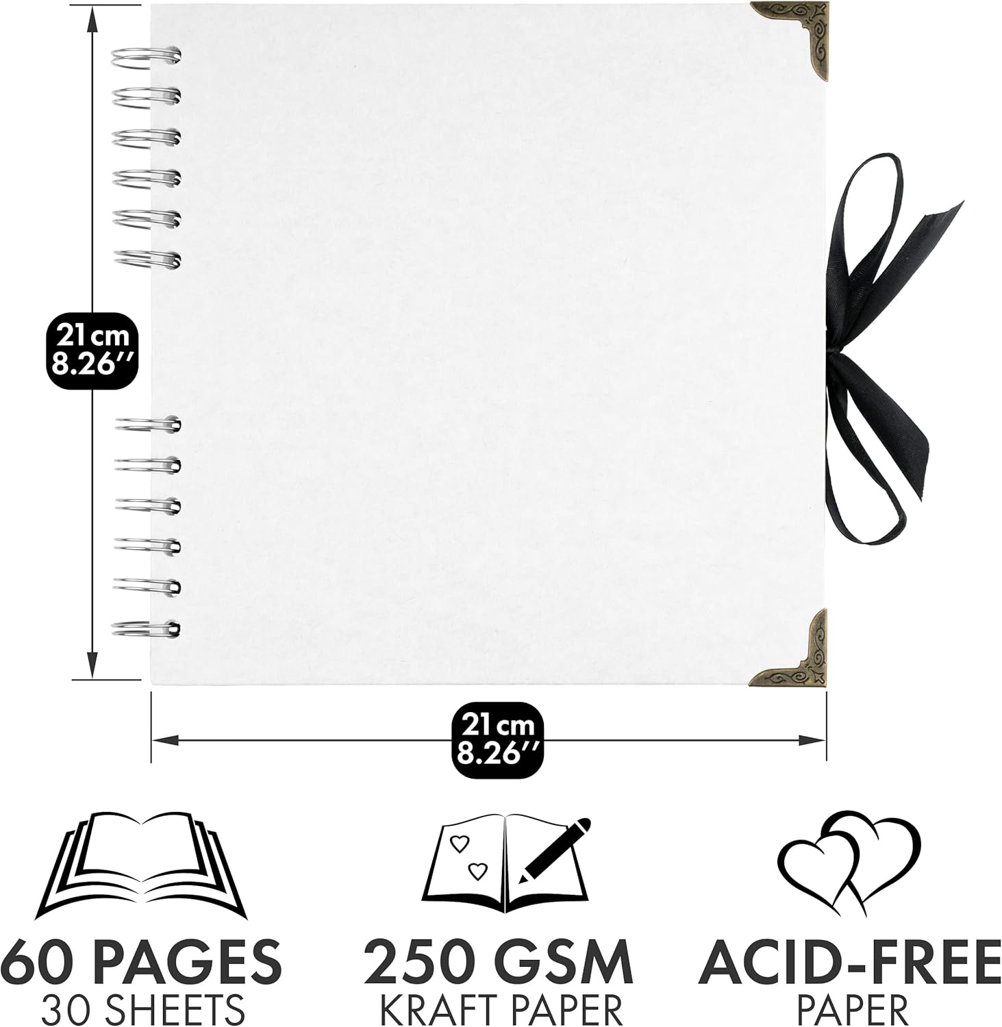 Bstorify Square Scrapbook Photo Albums 60 Pages (8 x 8 Inch) White Thick Paper, Hardcover, Metal Corners, Ribbon Closure - Ideal for Your Scrapbooking Albums, Art & Craft Projects (8 x 8 Inch, White)