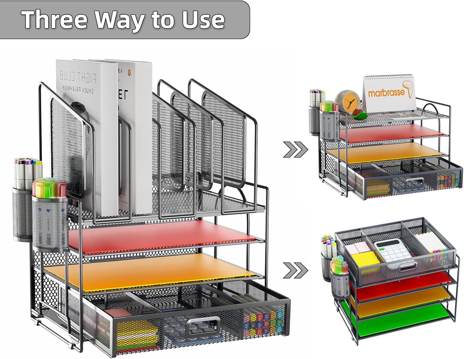 - 【Multifunctional Desk organizer】Marbrasse upgrade desktop file organizer has vertical and horizontal storage space – 4 sliding trays +5 vertical sorters +3 compartments drawer+ additional 2 pen holders . Upright section has five 3" Compartments for magazines, bill, file, book. Three types of use to meet your various office needs!!