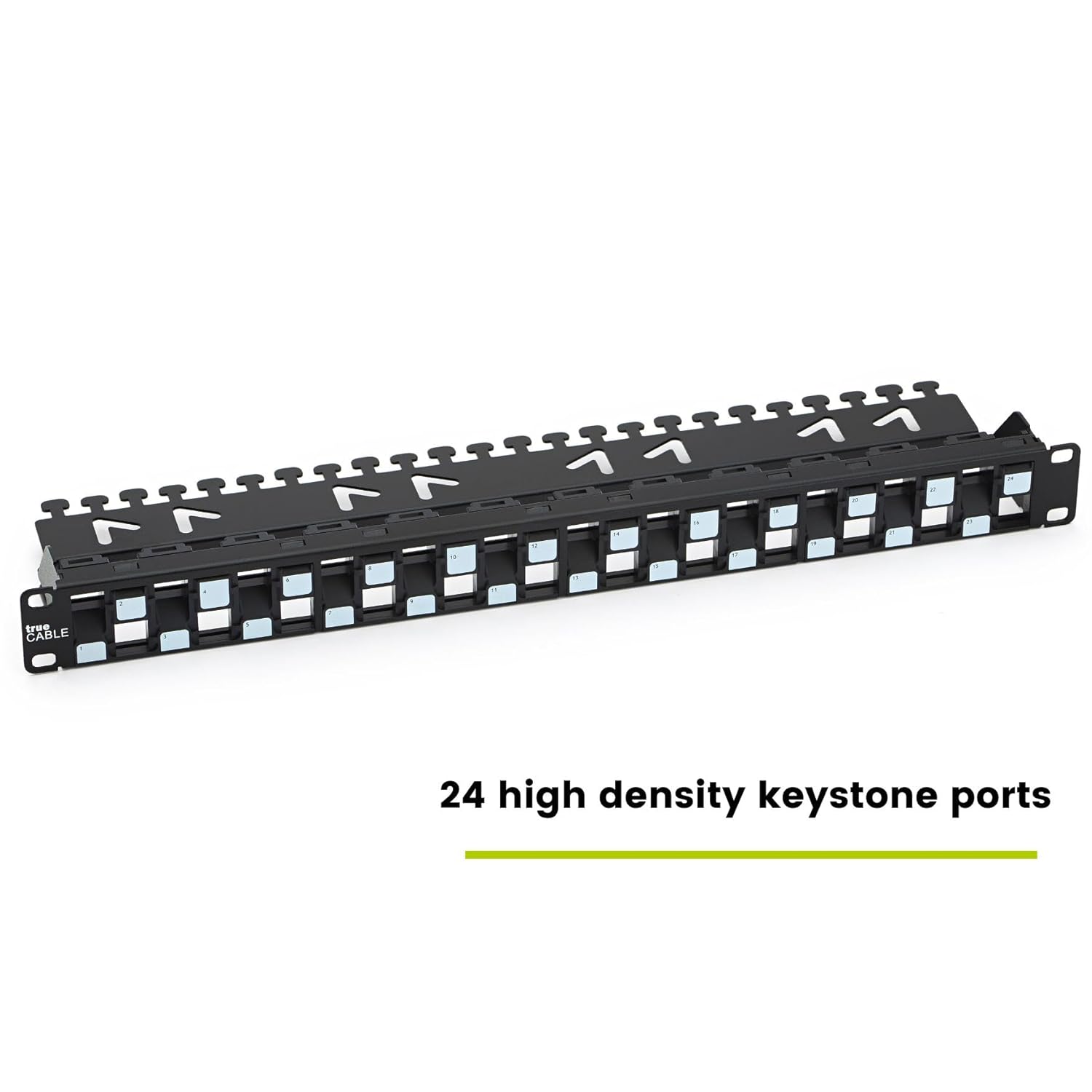 trueCABLE 3-D Staggered 24 Port 19” Toolless Modular Patch Panel, Unshielded, Blank, 1U Rack Mount, with Cable Management Bar, High Density, Black