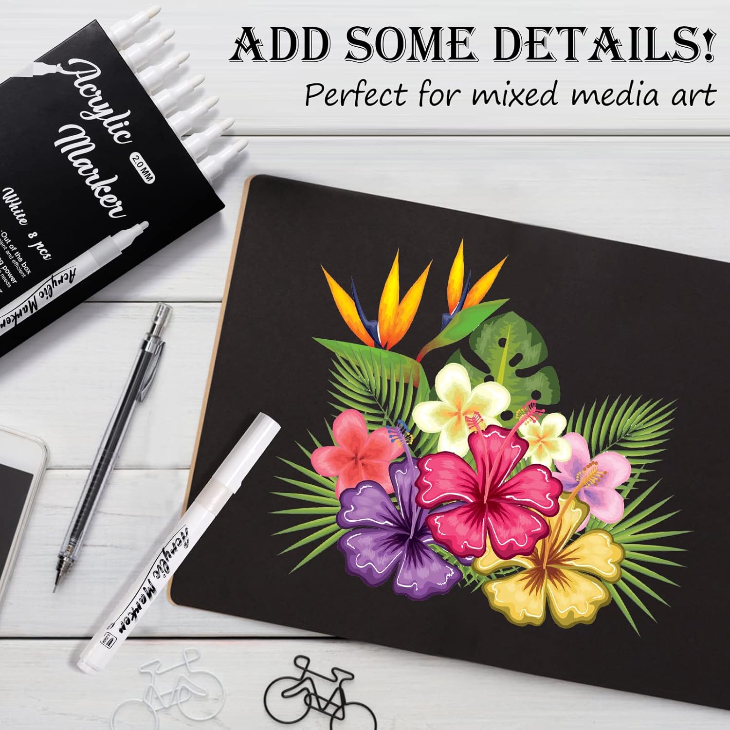 White Markers Pen, 8 Pack Paint Pens, Fine Tip Acrylic White Permanent Markers for Sketching, Drawing, Wood, Rock, Tyres, Plastic, Leather, Glass, DIY Painting