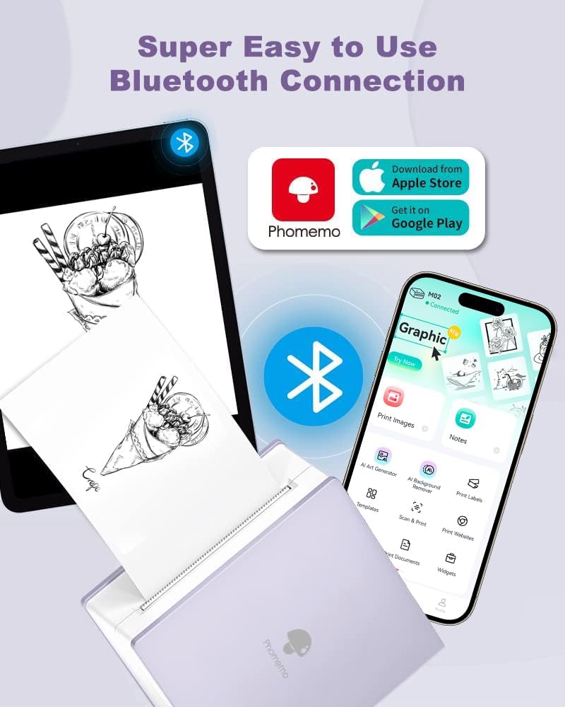 - Bluetooth Mini Thermal Printer- for cell phones and tablets with Bluetooth connectivity, compatible with Android 7.0 and iOS 13.0 or above.The Phomemo M02 sticker printer machine is an inkless wireless printer, you don't need any ink or toner. Not only is it suitable for white self-adhesive and thermal paper (only black and white colors can be printed), but it can also print patterns and text on colored and transparent paper rolls (special paper rolls can be printed in a single color)