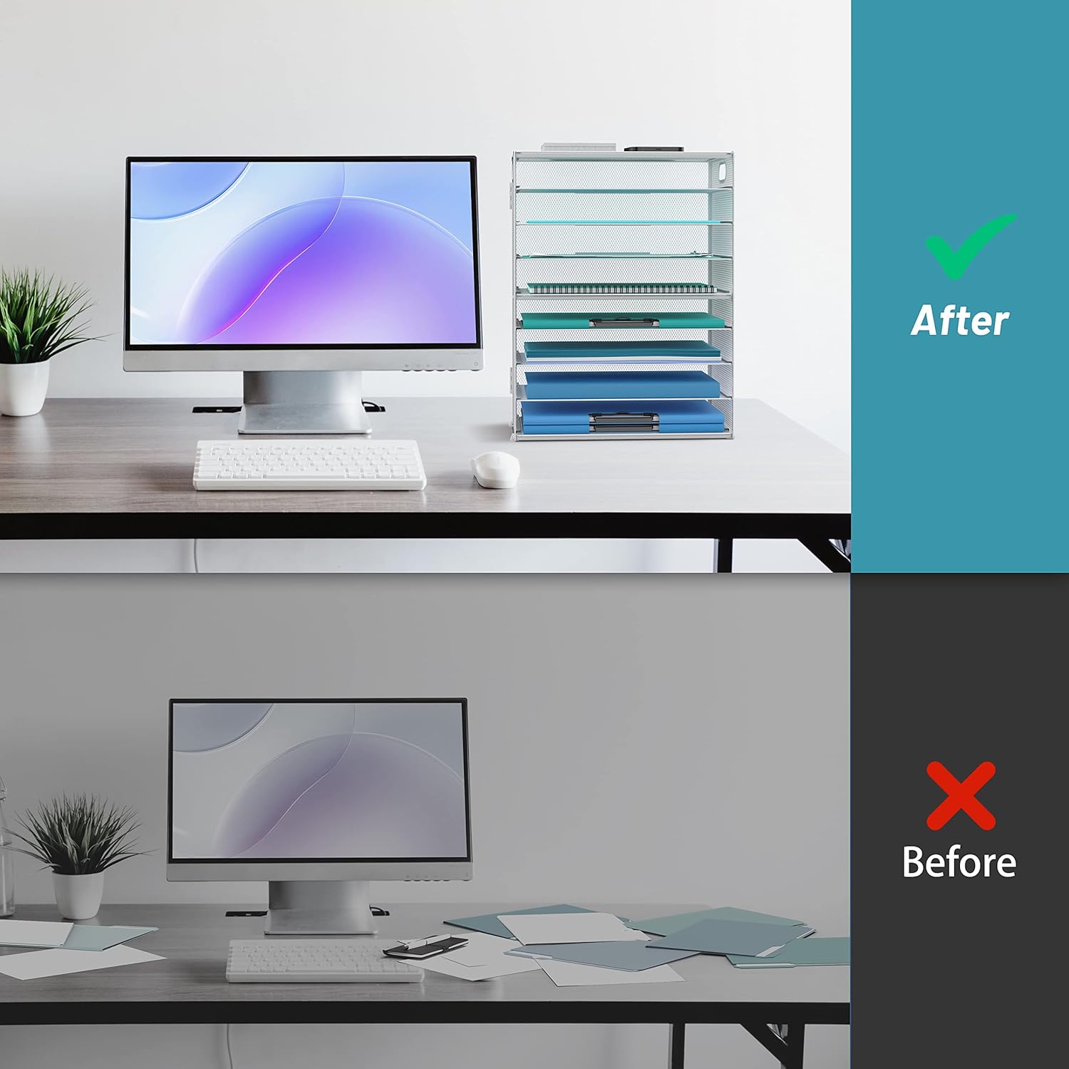 - [Perfect Paper Organizer] The 9-tier paper tray desk organizer has a large capacity for all your office supplies and accessories, such as: letters, paper, printing paper, books, folders, bills, magazines and so on. Keep your desk away from clutter and increase your productivity.