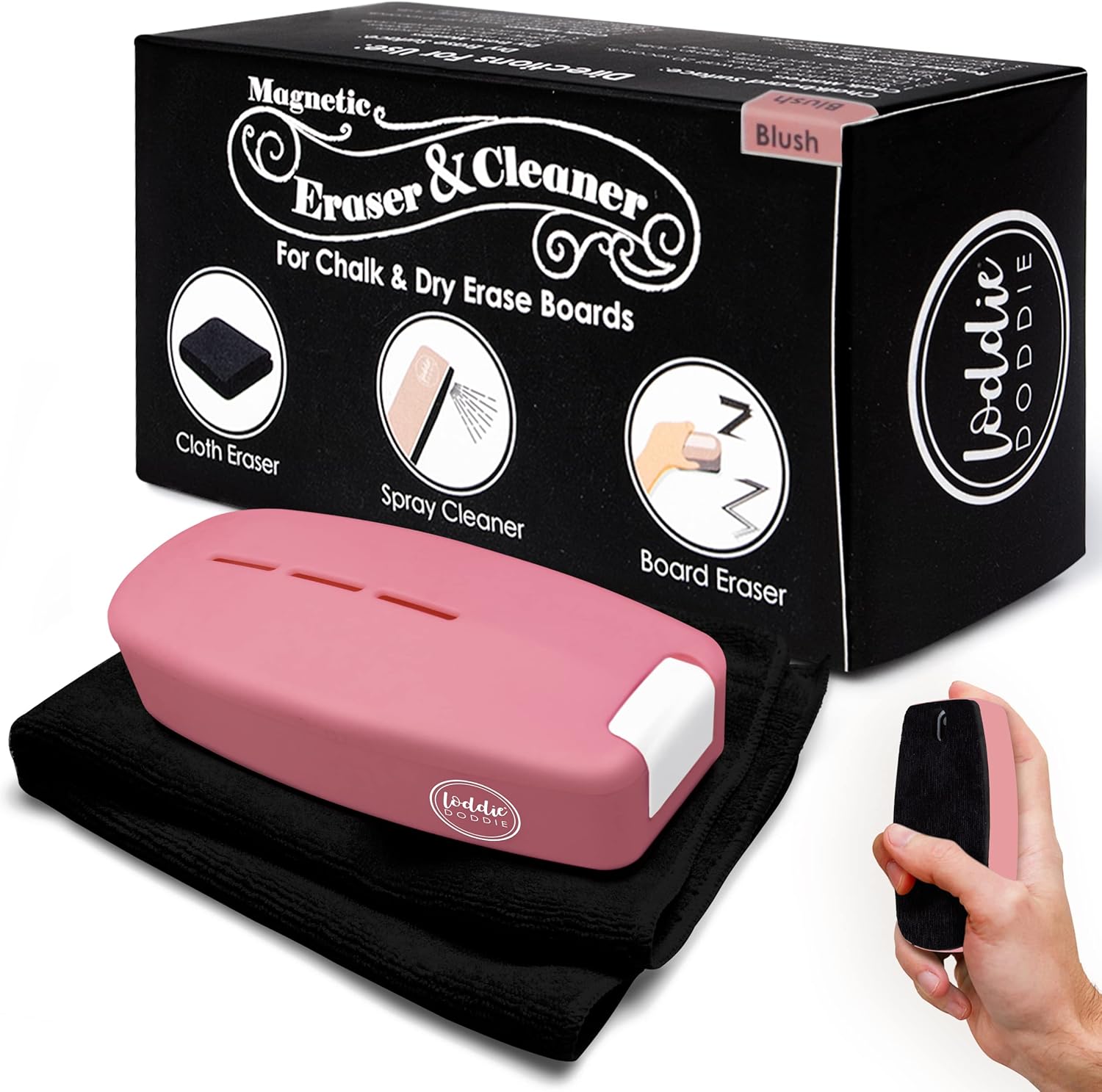 Loddie Doddie 2-in-1 Magnetic Pink Dry Erase Board Eraser - Blush Ergonomic TPE - Magnetic Holder for Whiteboard & Chalkboard - Non-Toxic Cleaner Spray & Bonus Microfiber Cloth - Teacher Supplies