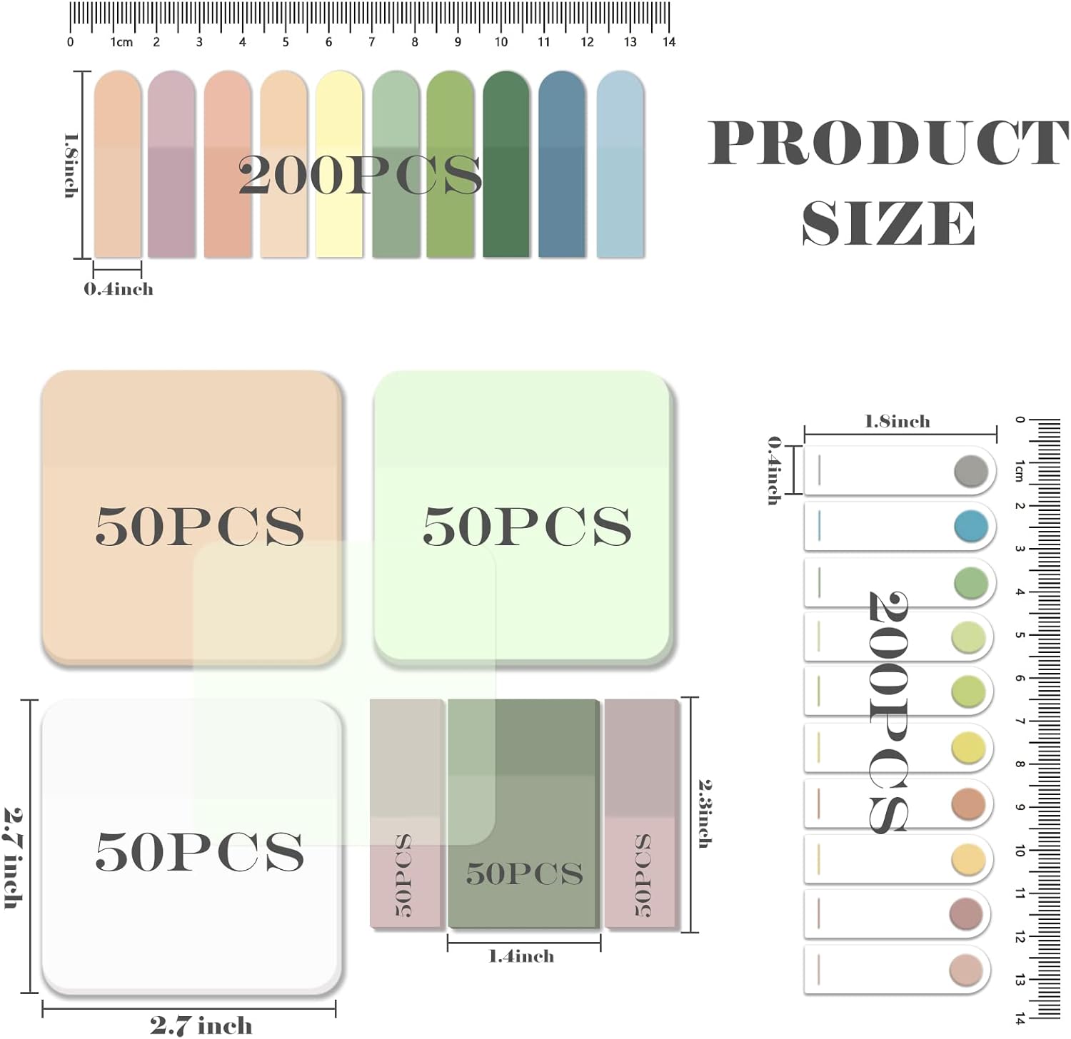 - What Will You Get: 150 Sheets transparent sticky notes( 3x3 inch ), 50 Sheets green translucent sticky notes(2.3x1.45 inch), 100 Sheets pink translucent sticky notes(2.3x0.7 inch), 400 Sheets morandi different colors book tabs(1.8x0.4 inch)