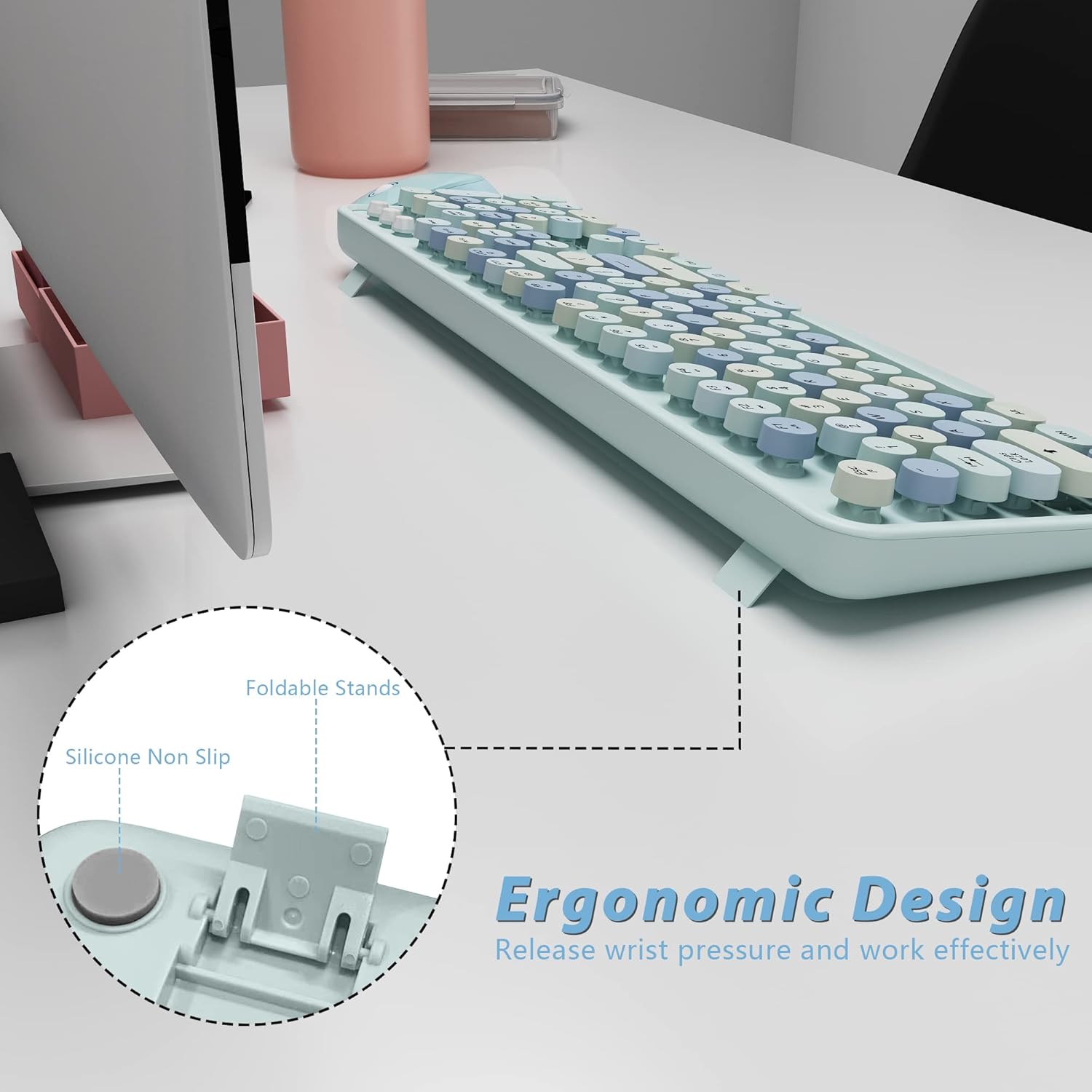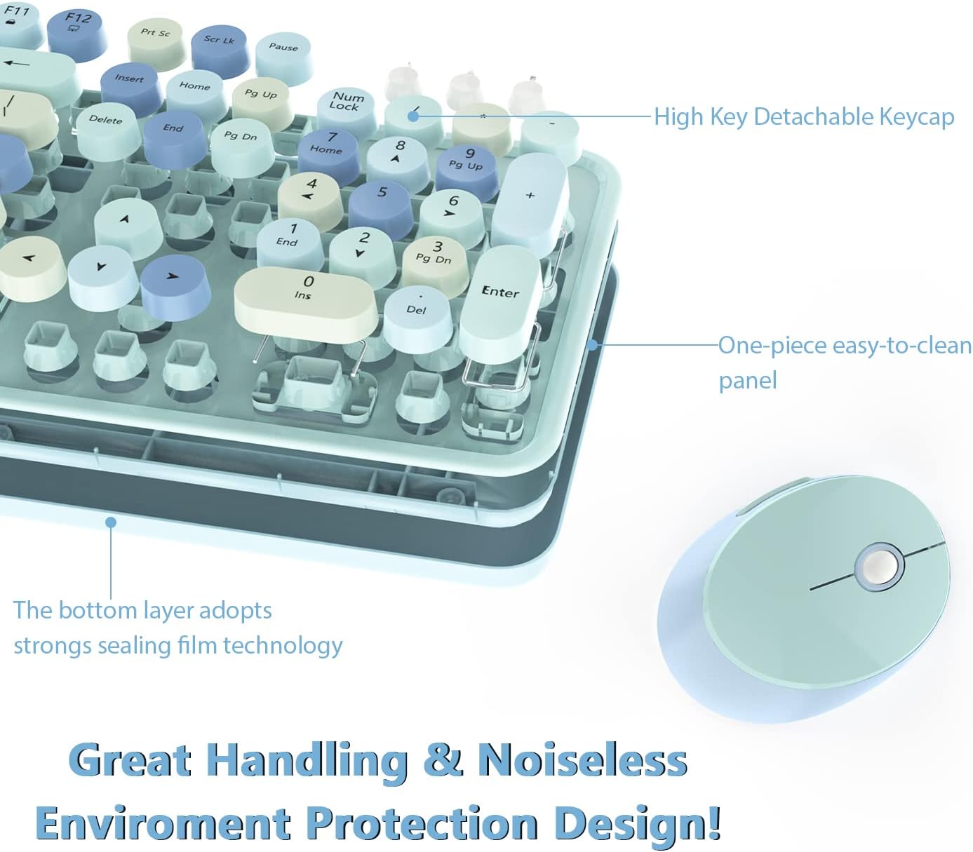 Wireless Keyboard and Mice Combo,Retro Round Keys Full-Sized Cute Keyboard, 2.4Ghz Dropout-Free Connection and Optical Mouse for Windows, Mac, PC, Laptop, Desktop (Blue-Colorful)