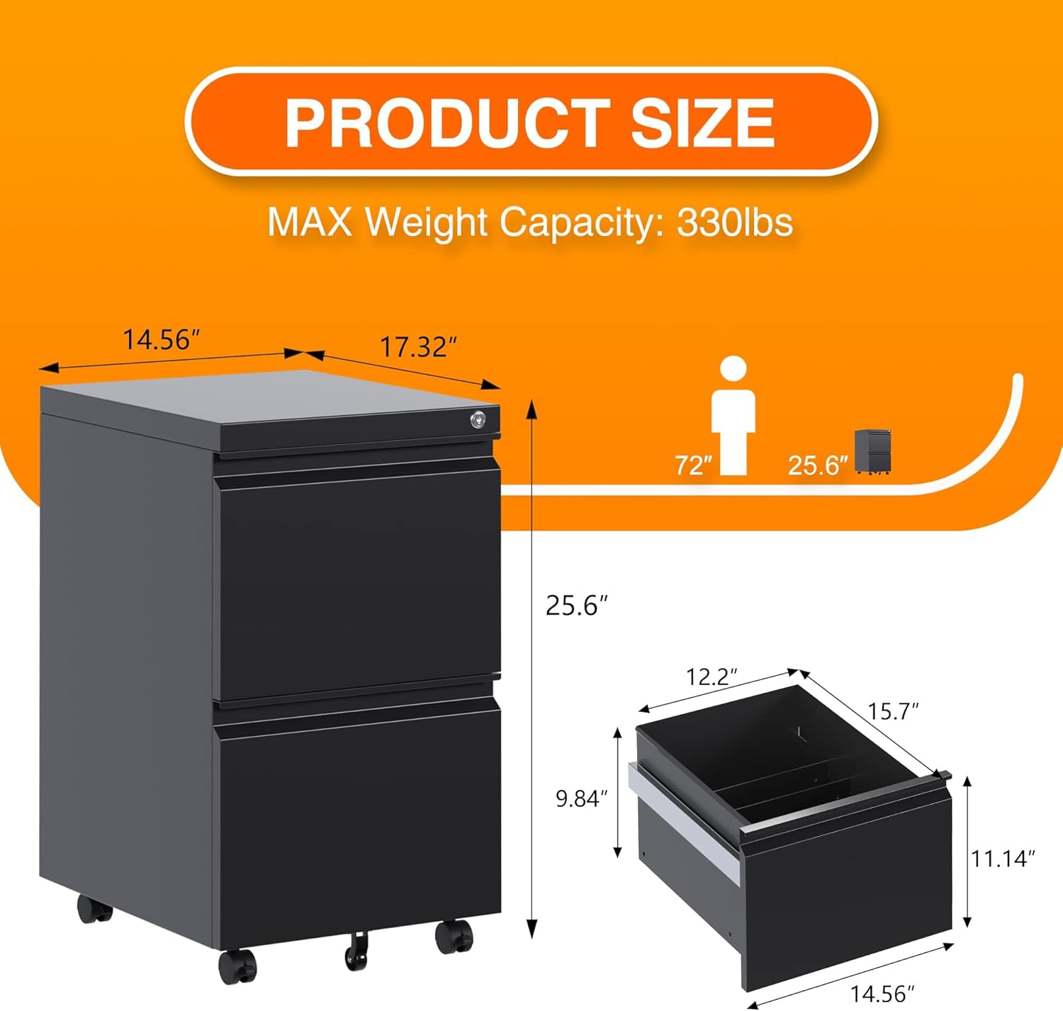 - ăFULLY ASSEMBLED EXCEPT WHEELSăFile cabinet deliver is fully assembled except the casters. Overall Dimension: 14.6" W x 17.3" D x 25.6" H