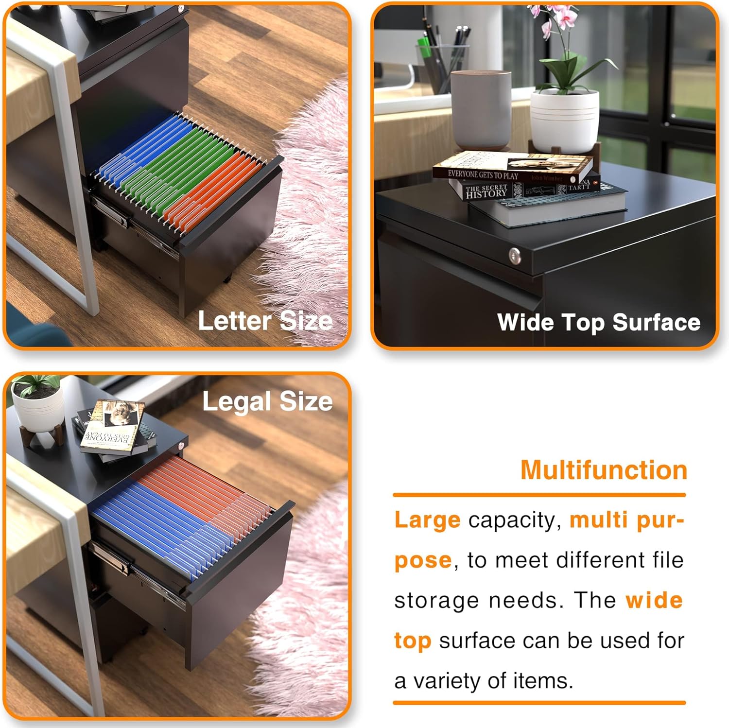 - ăORGANIZE YOUR WORKSPACEăFiles Cabinet equipped with 1 removable hanging bar, the filing cabinet can accommodate letter size, legal size and A4 hanging file folders through adjustment.