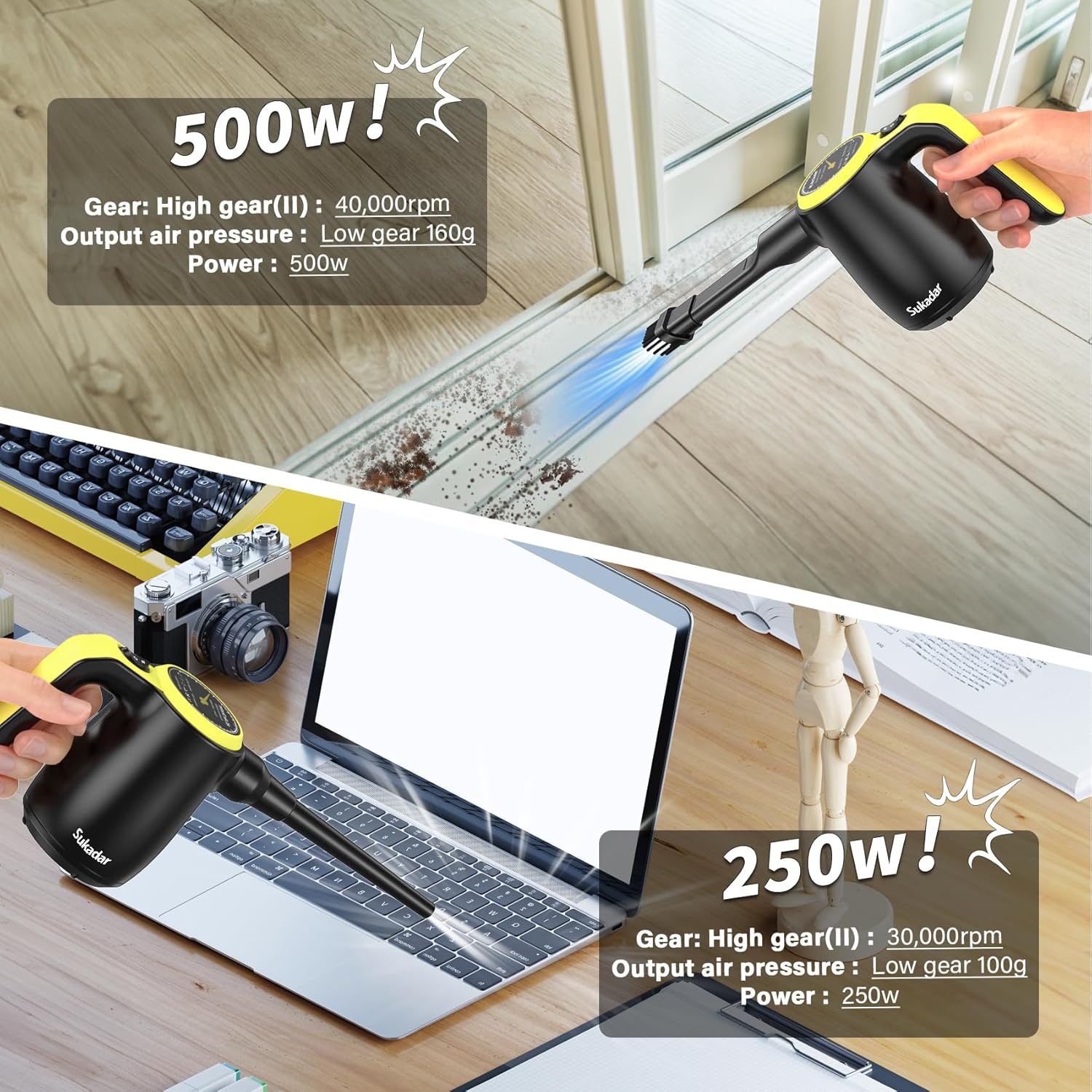 - 500w/250w⚡: Two Speeds Are Adjustable. The High Speed Gear Can Quickly Clean Stubborn Dust From Electronic Devices And Blow Out Hidden Items Under The Sofa. Bottom Speed Gear Won't Overbearingly Blow Away What Is Needed, Low Noise And Power Consumption.