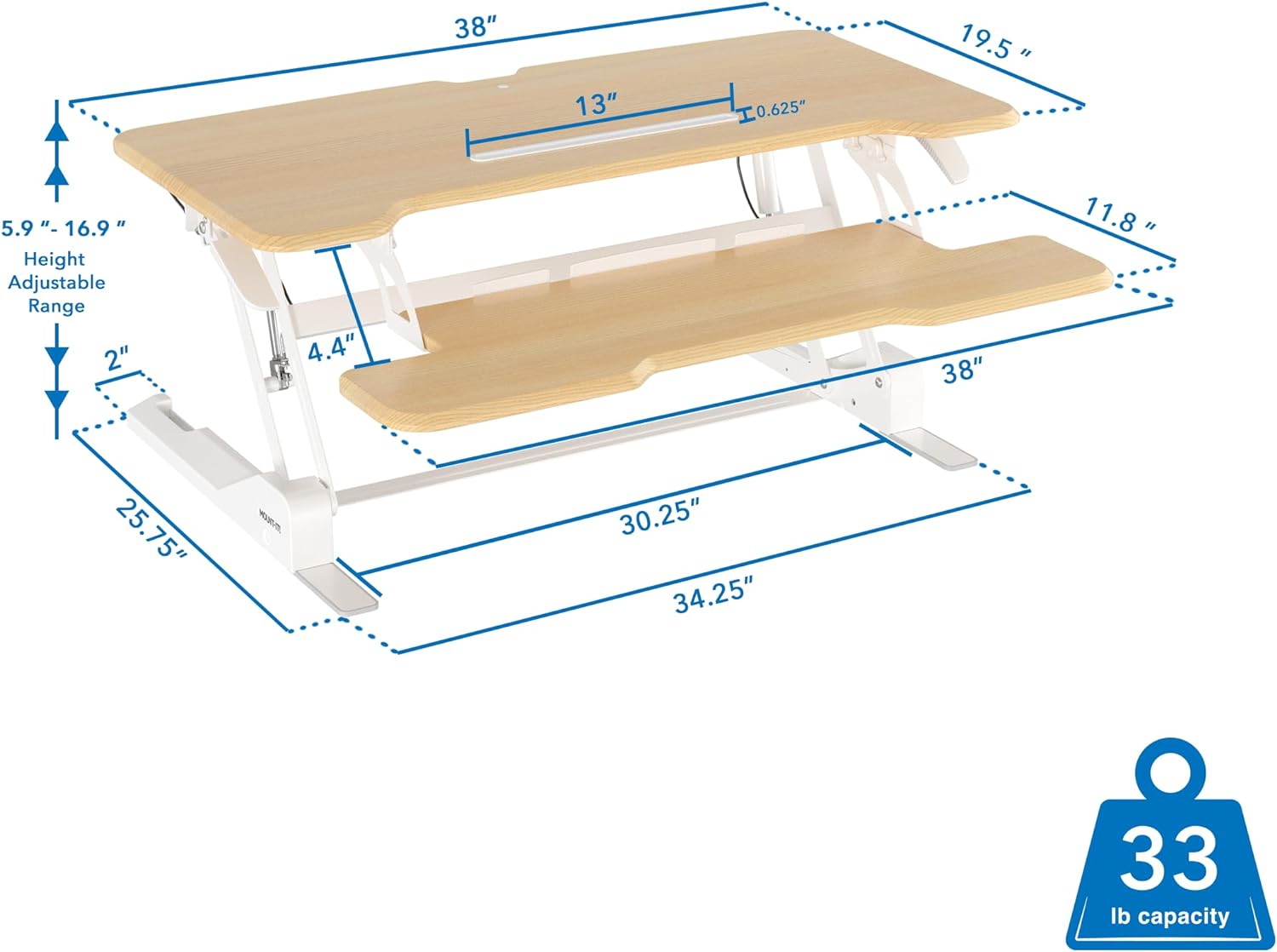 Mount-It! Height Adjustable Standing Desk Converter, 38” Wide, Desk Riser for 2 Monitors, Manual Gas Spring Sit Stand Desktop Raises to 16.9", Fits Two Monitor Screens with Keyboard Mouse Tray Maple