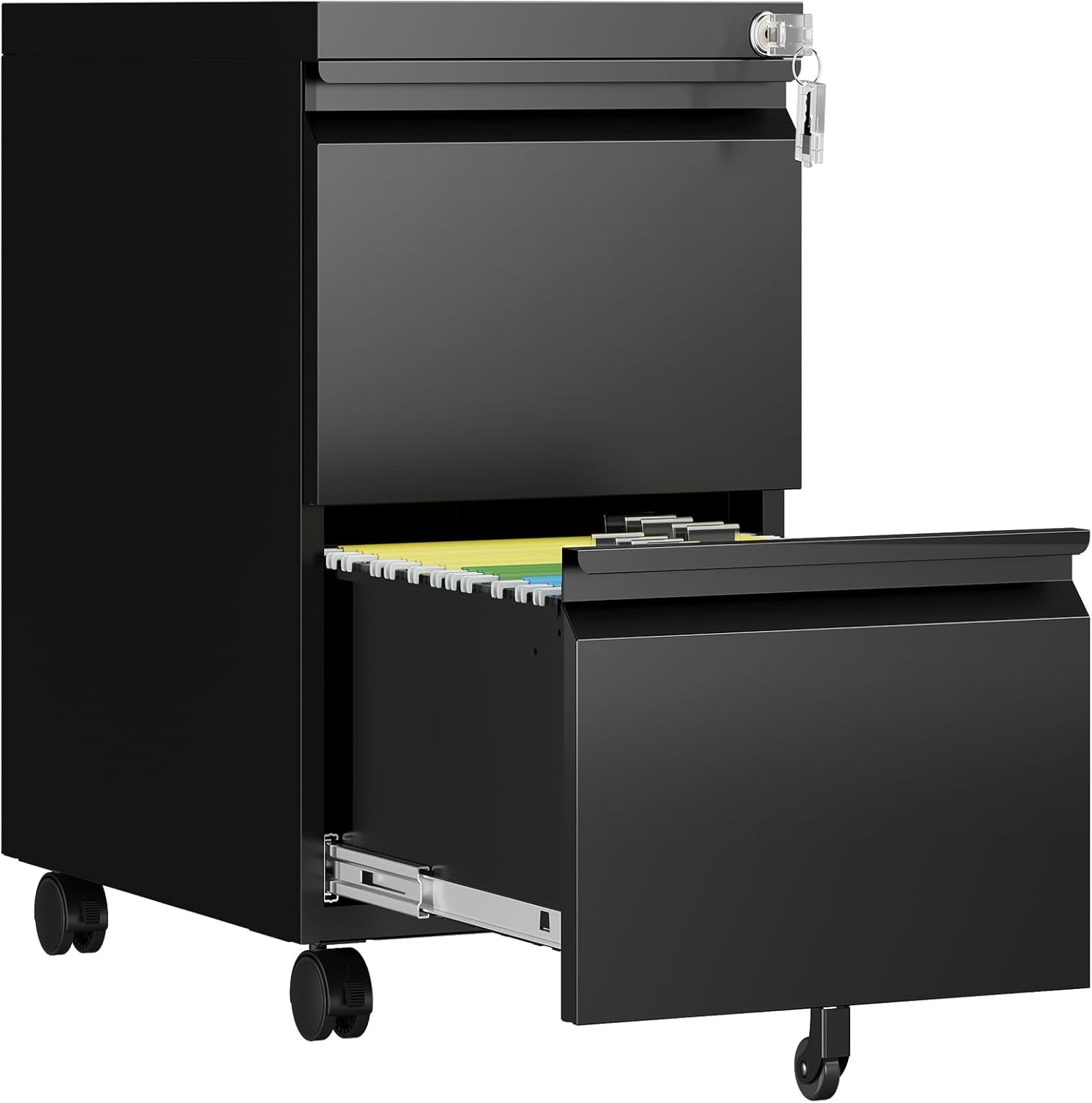 2 Drawer File Cabinet with Lock, Rolling File Cabinets for Home Office, Small Metal Filing Cabinet Office Drawers Under Desk for Letters/Legal/A4 Size, Assembly Required