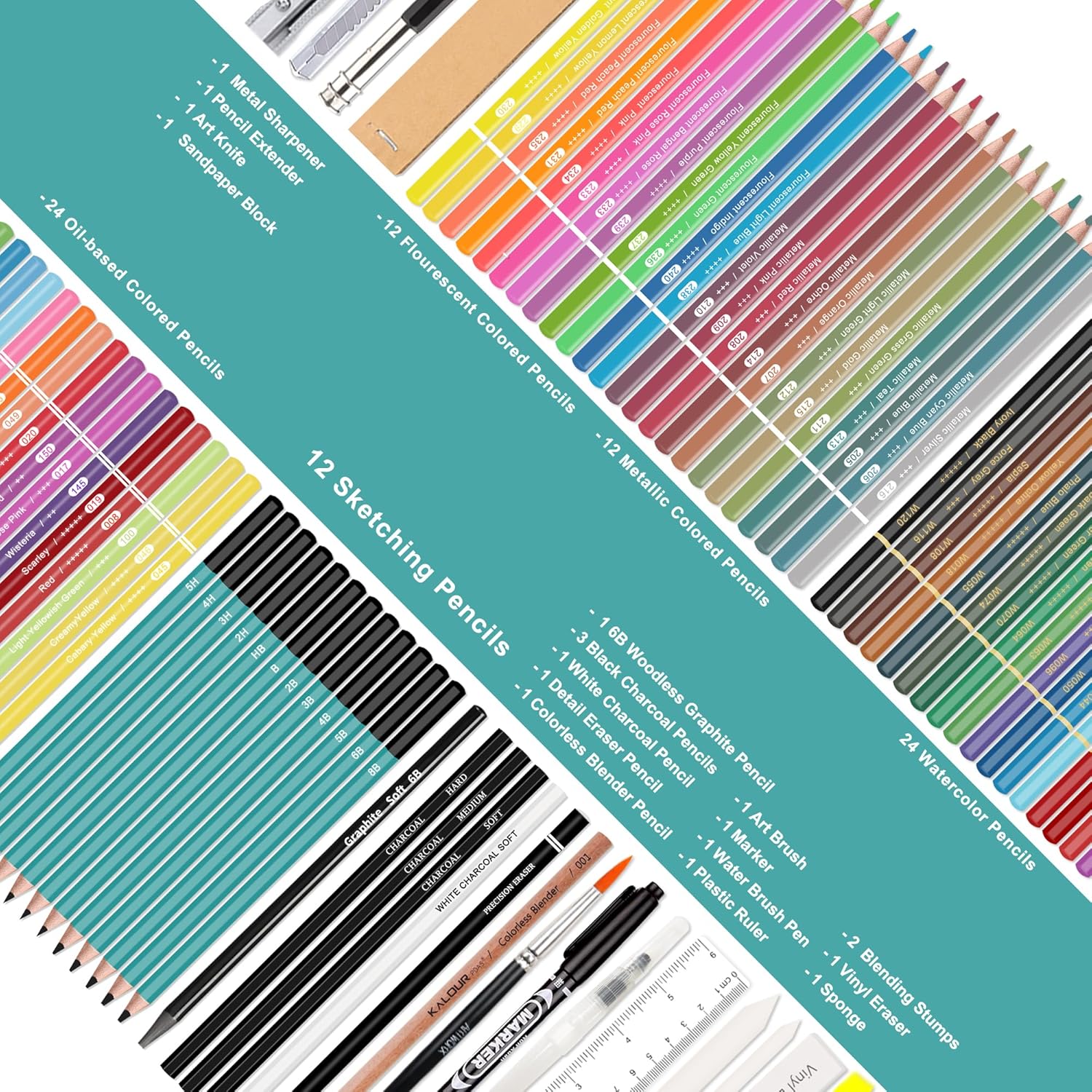 - Artist Pencils - This drawing set includes 91 pieces Drawing Pencils:12 Sketching Pencil,3 Charcoal Pencil,24 Colored Pencil,24 Watercolor Pencil,12 Metallic Pencil,12 flourescent color pencils,1 white charcoal pencil,1 colorless blender pencil,1 eraser pencil,1 woodless graphite pencil.Each pencil is marked with color name and number.our pre-sharpened art pencils for accurate visual creativity and crisp lines.Soft break-resistant cores produce incredible tone.