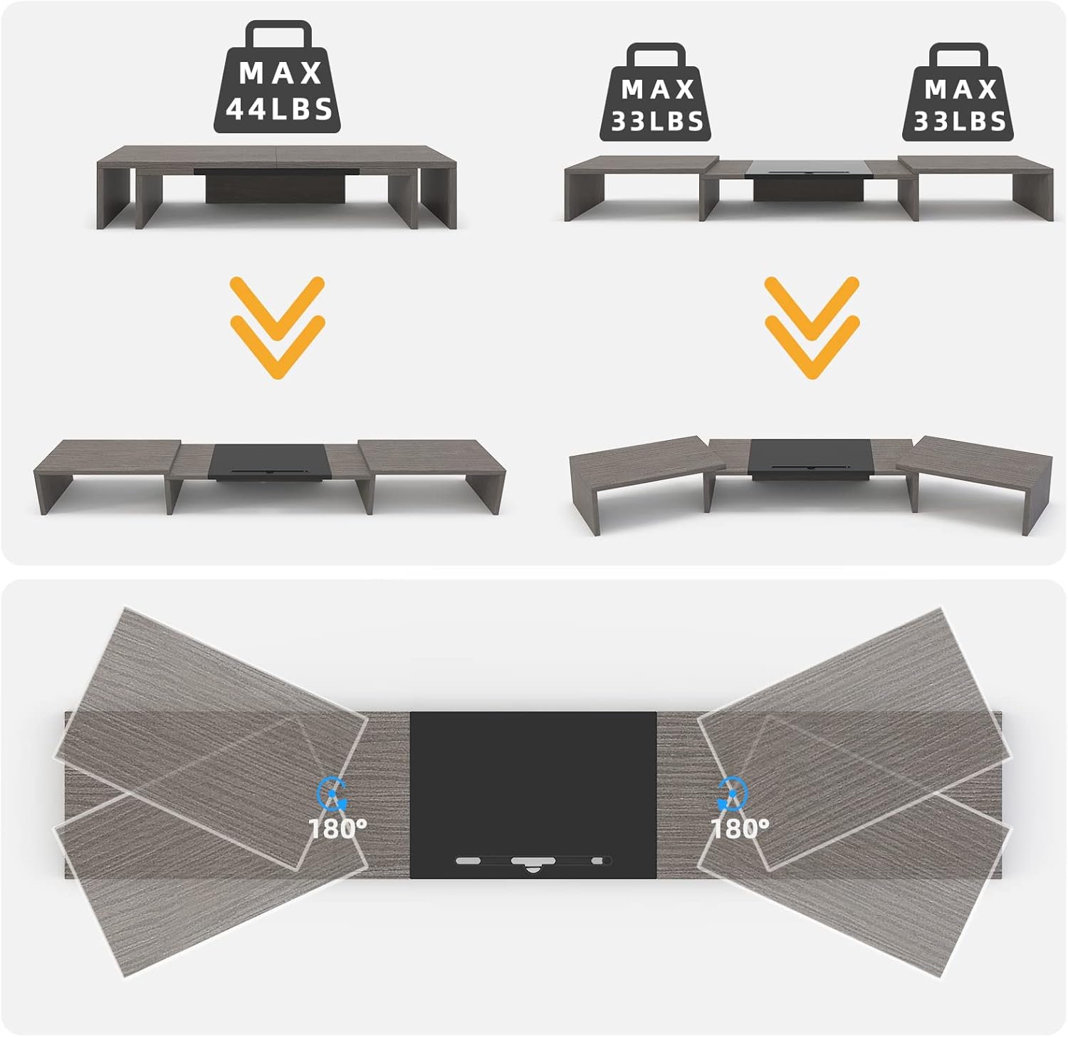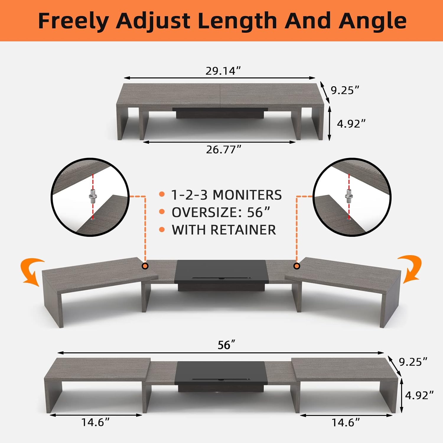 - ✅【 FREELY ADJUST LENGTH AND ANGLE 】Extra large monitor stand can be offered a max size for 3 monitors,also it can be folded to a min size for 1 large monitor. Two side of triple monitor stand can be adjusted +/-90°angle.YOU CAN FREELY arrange your devices even if your desk is irregular, such as dual monitor, laptop, tablet, lamp, phone, speaker, etc.