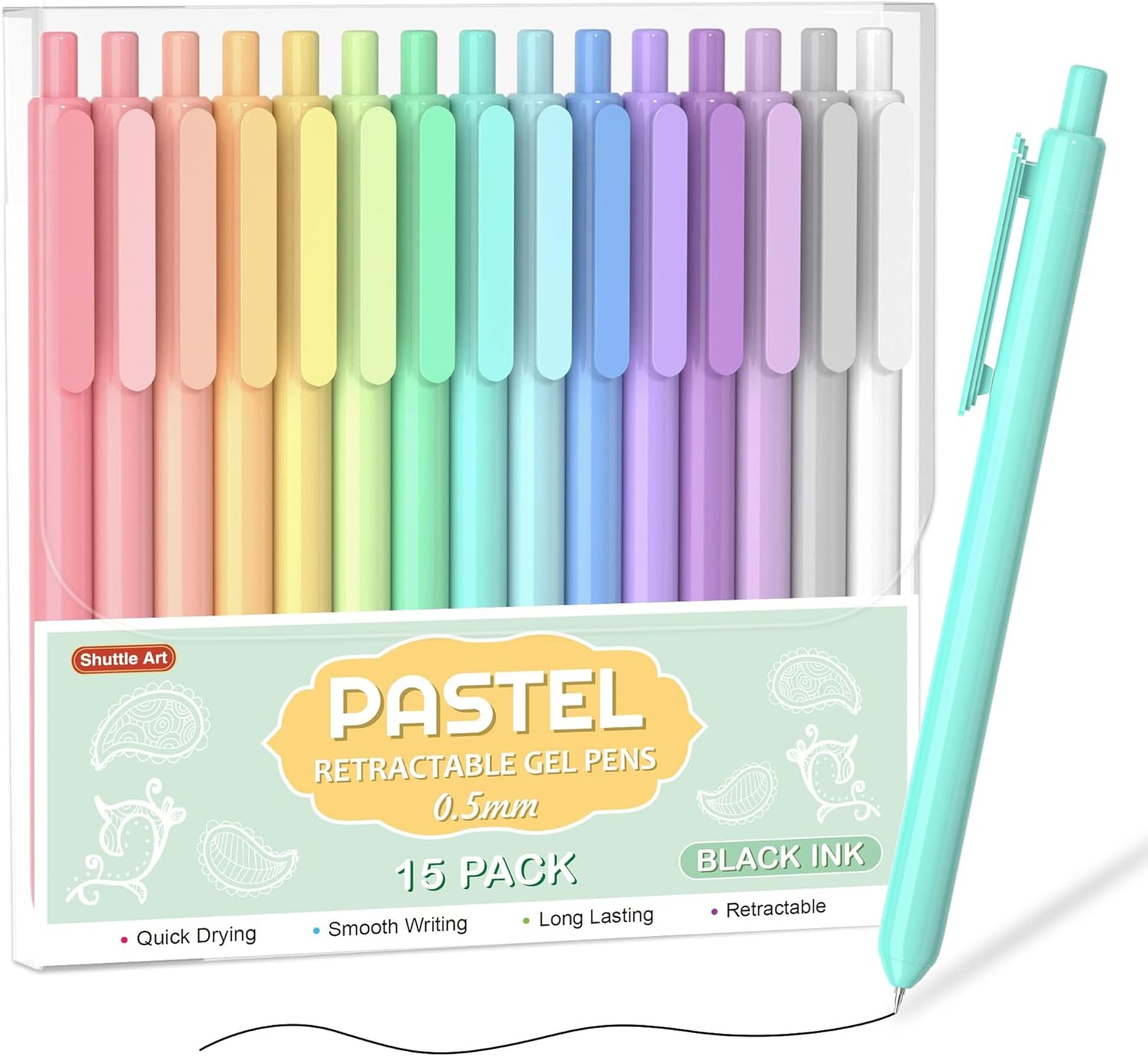 Shuttle Art Retractable Pastel Gel Ink Pens, 15 Pack Black Ink Pens, Cute Pens 0.5mm Fine Point for Writing Journaling Taking Notes School Office Home