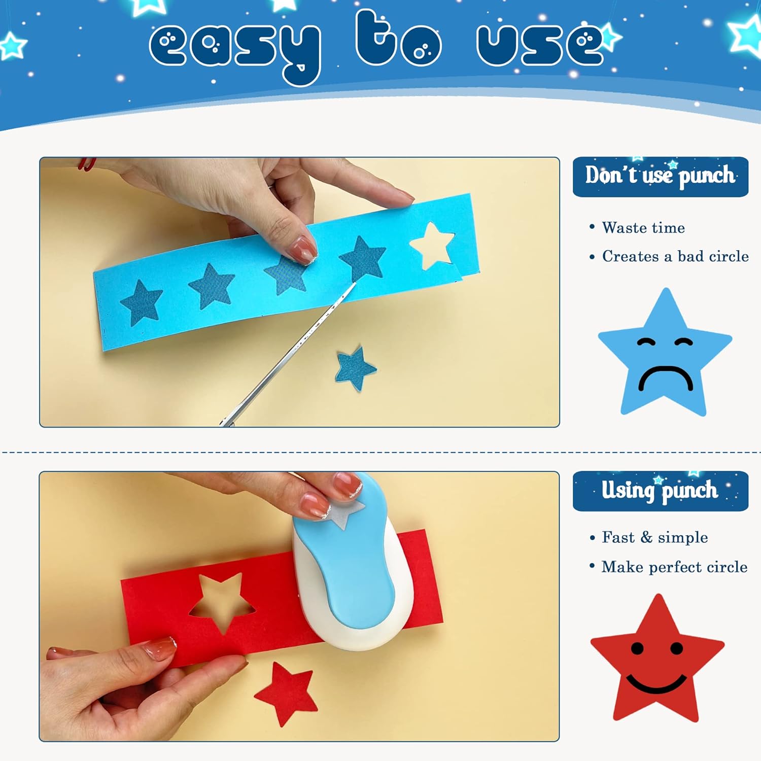 - ❤ ROMANTIC & ADORABLE: These craft star punches can help you create crisp, star shaped designs from card-stock, paper, cardboard and more, adorable embossed patterns are sure to add romantic and warm elements for your different craft works.