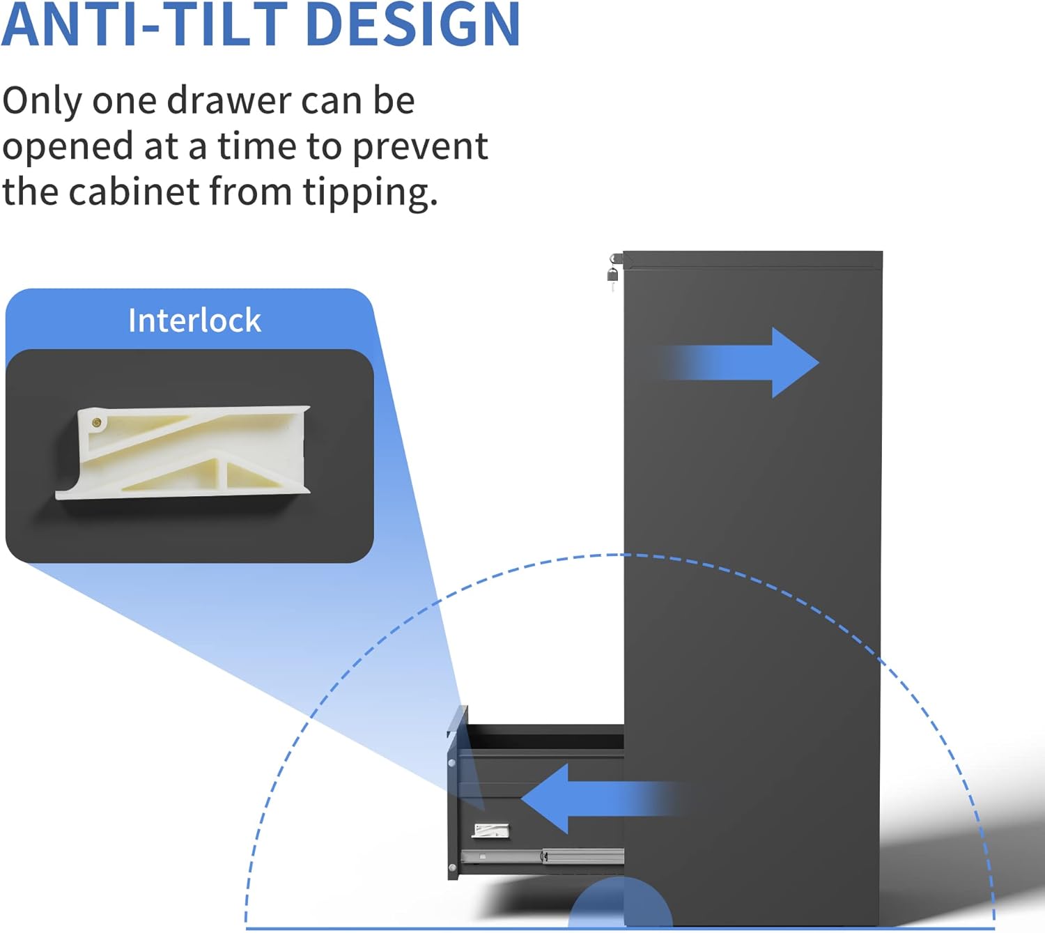 - ăAnti-tilt DesignăThis filing cabinet 4 drawer designed with full extension and steel ball-bearing suspension, all drawers of the file cabinets can be opened and closed quietly and easily. The anti-tilt system ensures that only one drawer can be open at a time, preventing the metal file cabinet from tipping over. You can have peace of mind knowing that your important documents and items are safe and secure.