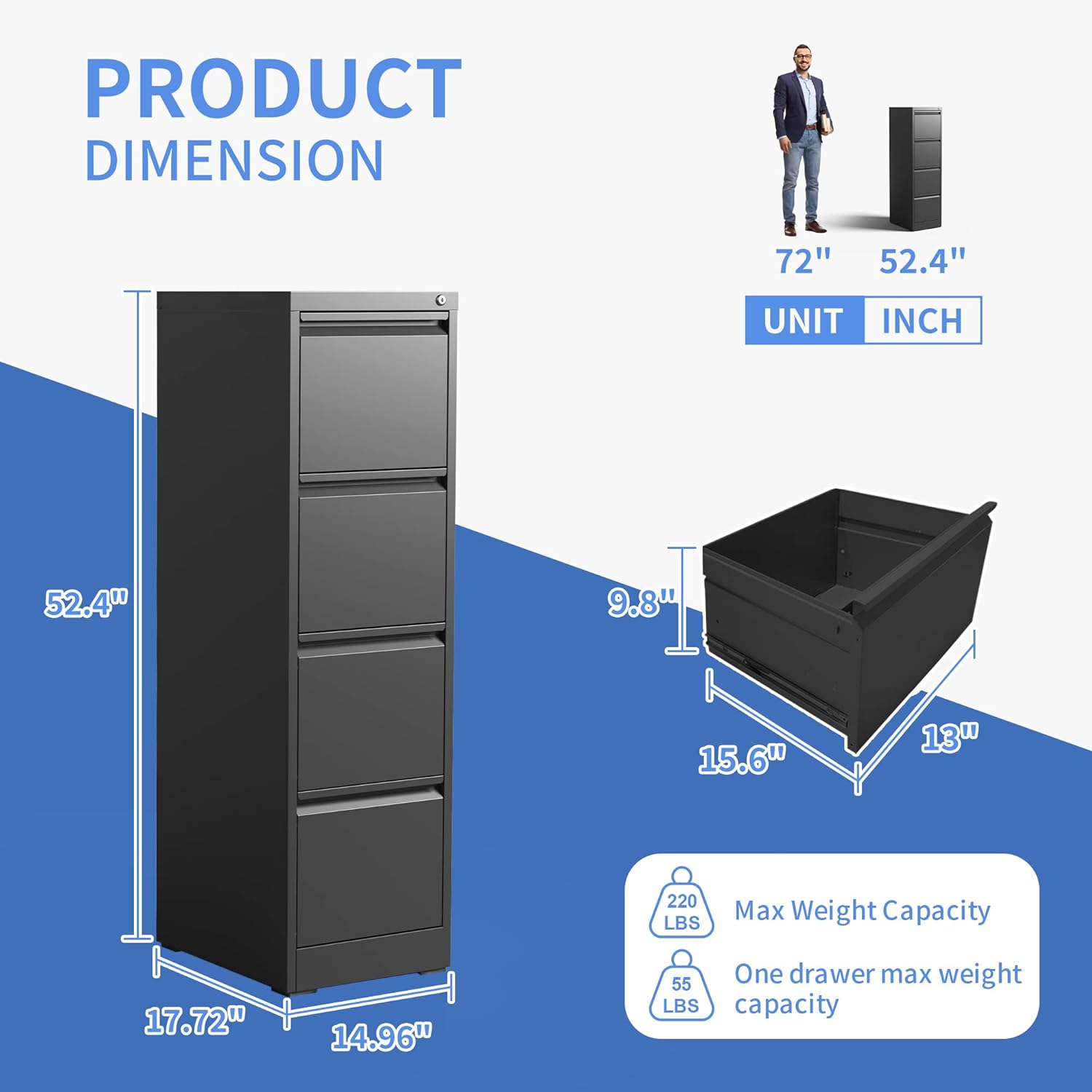- ăMultiple Storage TypesăThis 4 drawer vertical file cabinet for home office is larger and deeper than similar cabinets in the market. Making it the perfect solution for all your storage needs. The drawers of the 4 drawer metal file cabinet are also equipped with one adjustable hanging rail, allowing you to perfectly store letters, legal, A4 size folders and file box to meet your different needs.