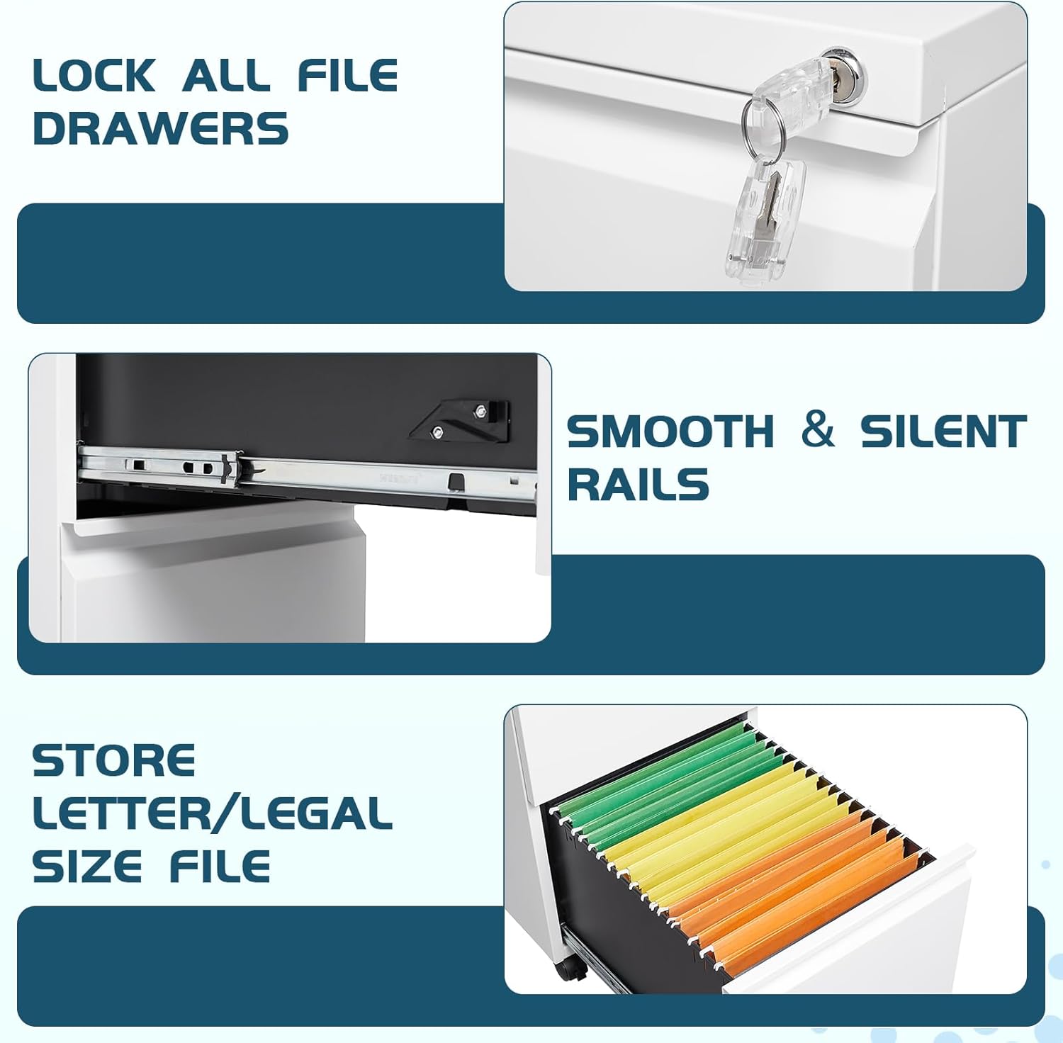 - ăLocking Cabinet for Securityă: A lock is set at the top of our file cabinet and is designed to lock all drawers. This helps to keep your sensitive documents secure from prying eyes. You are provided with two keys for the lock.