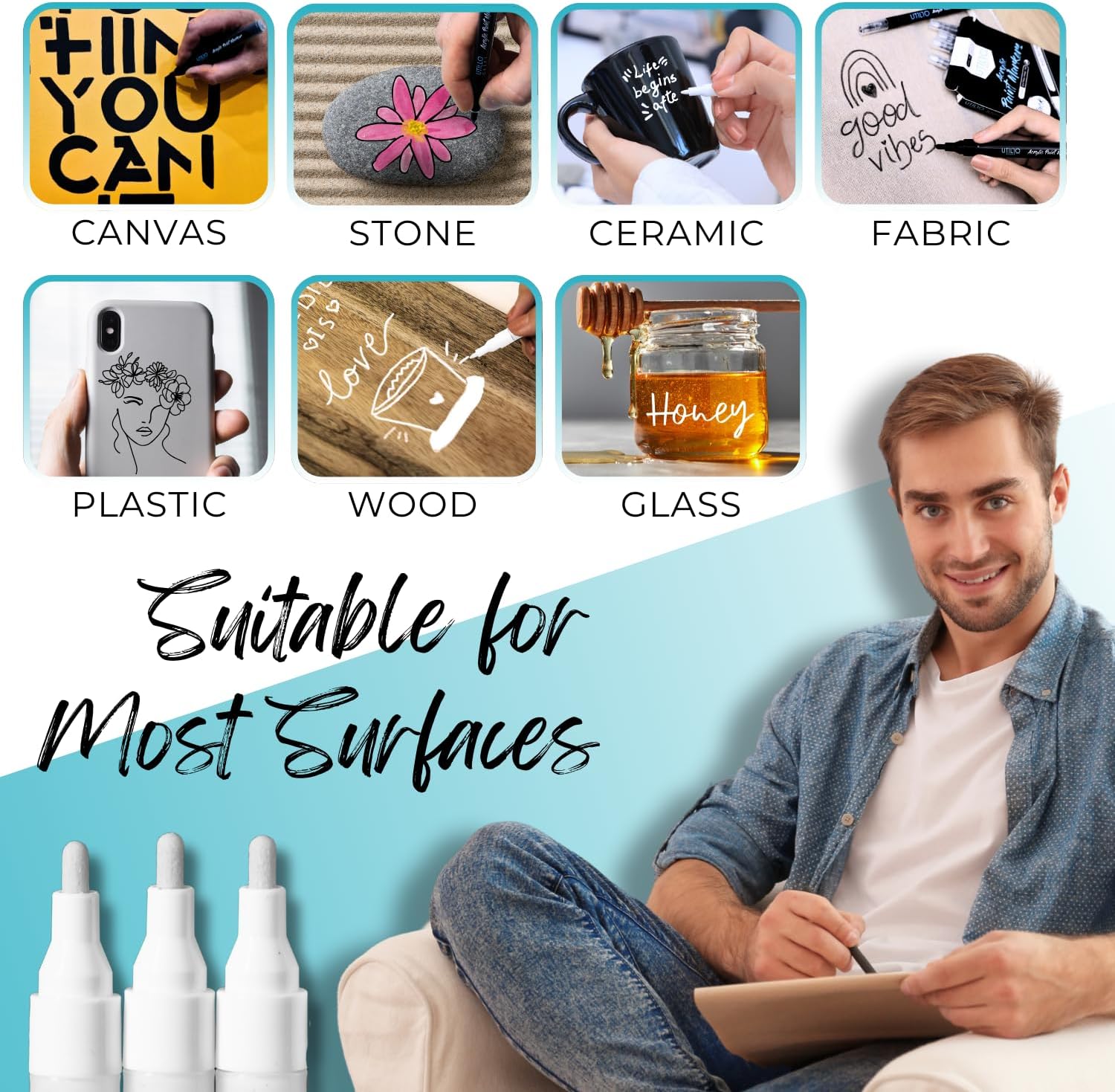 - ☑️ PAINT ON ANYTHING - Use our white black paint pens on stone, wood, glass, fabric, pottery, plastic, canvas, leather, cardboard, construction paper, ceramic, metal, cement, canvas, rubber, cloth, leather, terra-cotta, chalkboards--pretty much anything you can imagine!