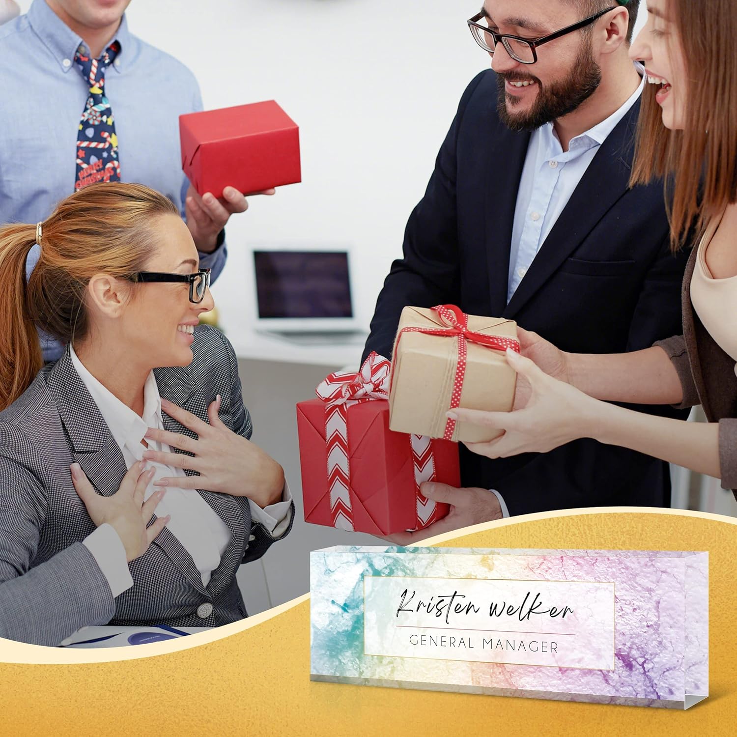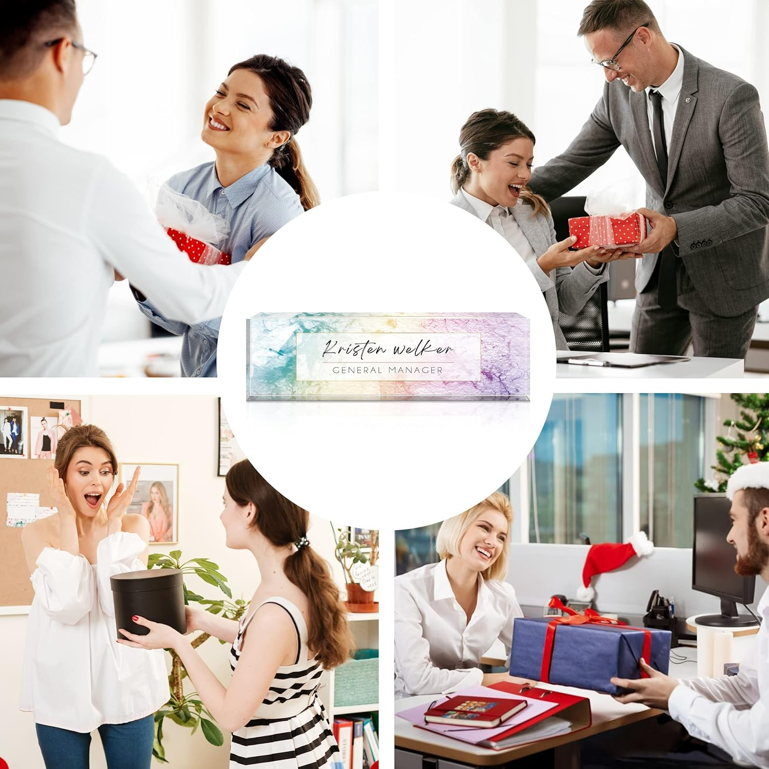 - šCustom A Great Office Decor Gift: Whether for holiday, birthday or work anniversaries, DIY a unique name plate for them, this premium acrylic glass block name plate will impress! Let your coworkers know you appreciate them.