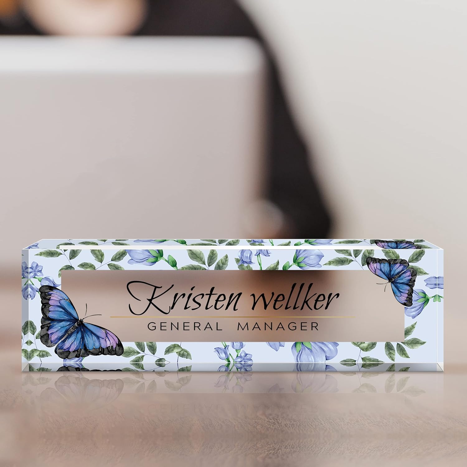 Desk Name Plate Personalized, Premium Purple Blue Butterfly Acrylic Desk Name Plate, Personalized Name Plate for Desk, Office Decor for Women or Men Coworkers, Boss, Employee, Teacher