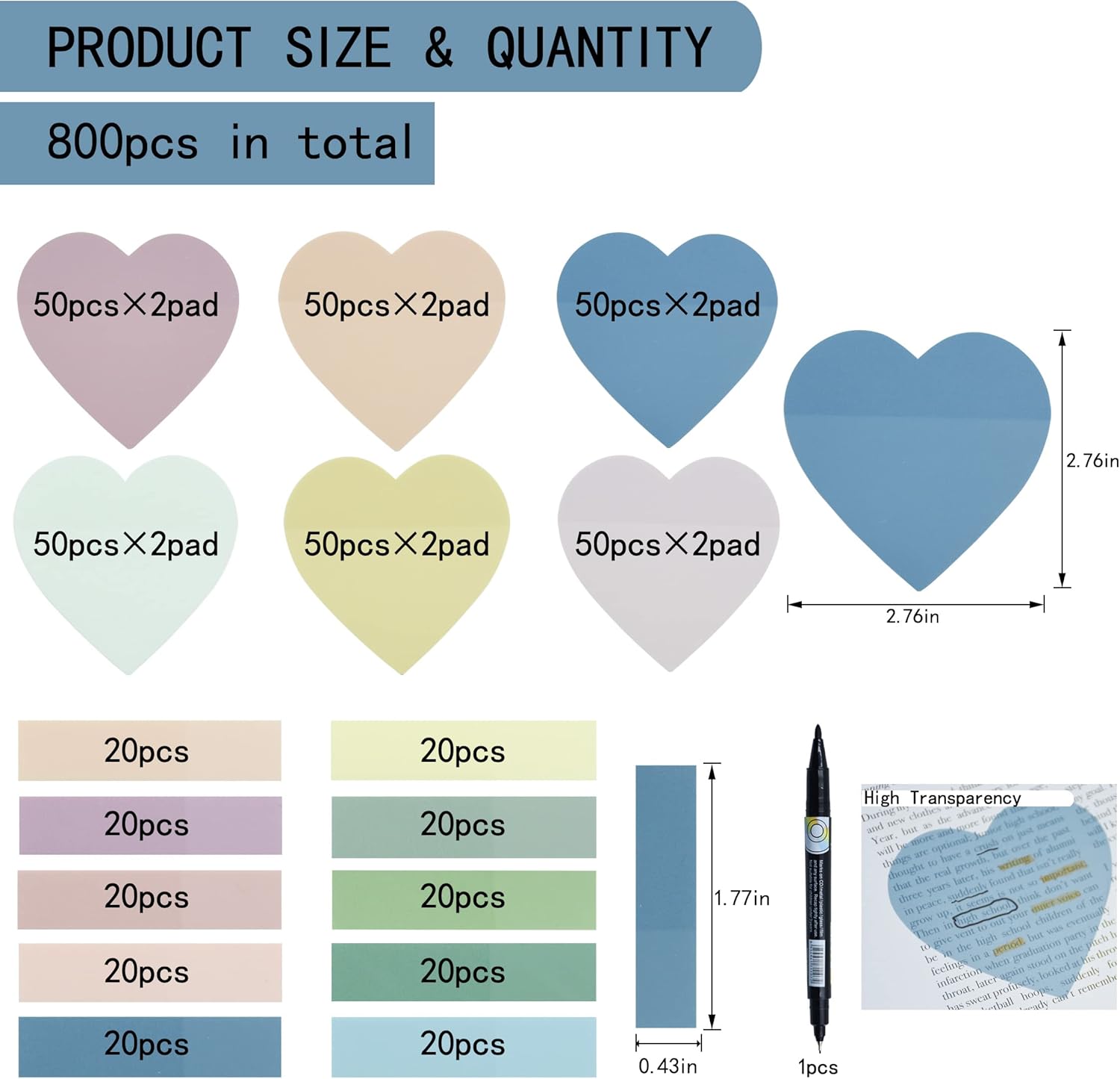 - 【Package Including】You will get 600 sheets 2.76x2.76 inch heart transparent sticky notes and 200 sheets 1.73x0.43 inch transparent sticky note tabs (800 sheets in total), and with a marker pen. A variety of Morandi color combinations to meet your any color requirements. The see through sticky notes lightweight and easy to carry.