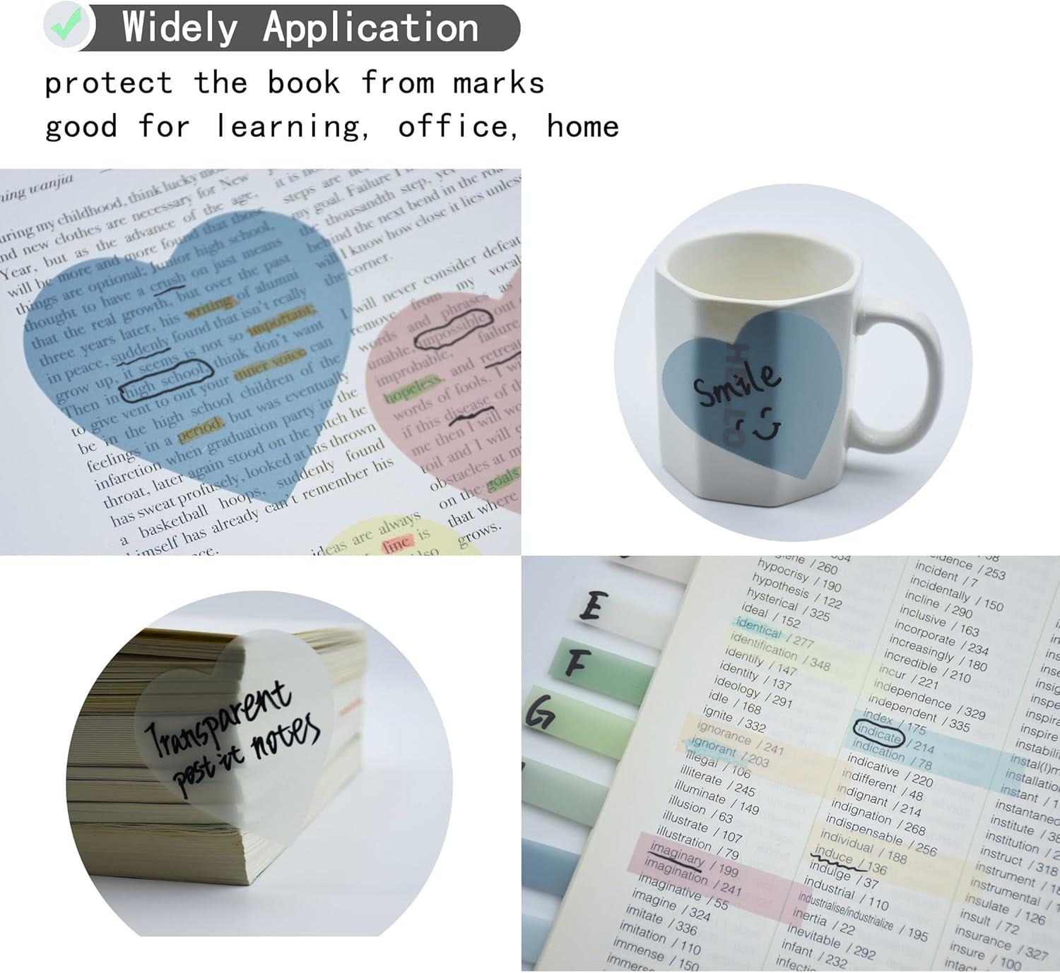 - 【Wide Applications】Translucent sticky notes make our life and work more pleasant and efficient, Ideal for school, home, offices, study rooms, students, teachers, doctors and nurses use. You can stick the translucent sticky notes on bible, books, notes, tabletops, doors, walls, whiteboards, bathroom mirrors or any other smooth surfaces.