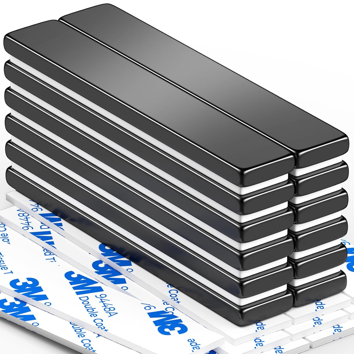 Grtard 12 Pack Neodymium Magnets Bar, Super Strong Rare Earth Magnets Bar, Powerful Magnets Bar with Double-Sided Adhesive for Fridge, Garage, Kitchen, Science, Craft, Office, DIY - 60 x 10 x 3 mm