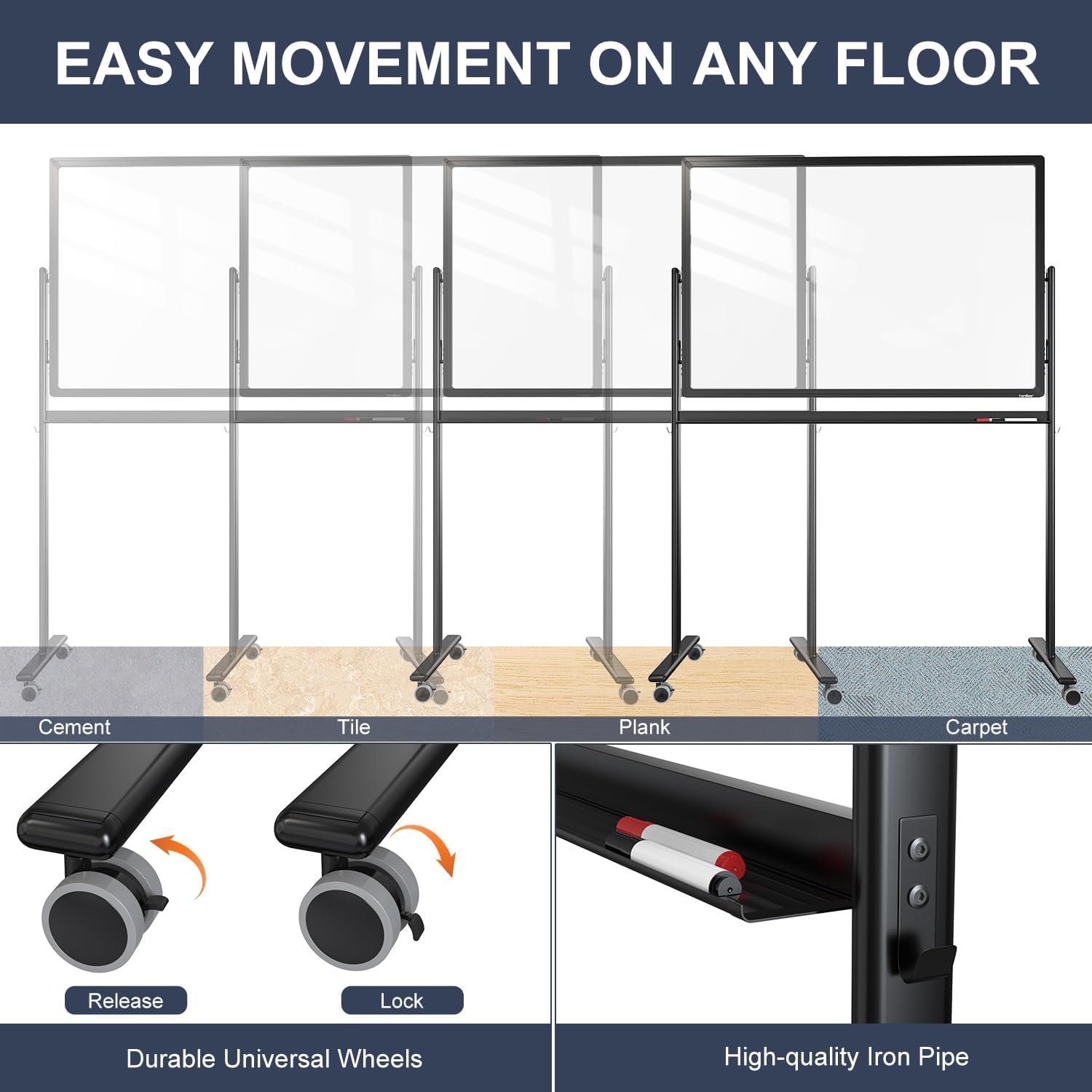 - 360° ROTATED & LOCKABLE - The mobile dry erase board comes with 4 sturdy universal wheels that support 360-degree rotation, allowing you to move easily whether on hard floors or carpets. Each wheel has a locking system to keep it stable while writing and wiping.