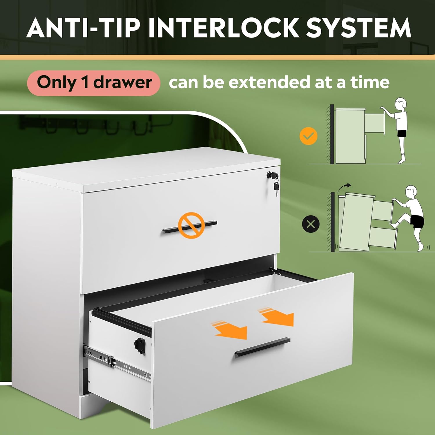 - ANTI-TILT Mechanism: It is vital that only 1 drawer at a time can be opened, this wood file cabinet provides maximum flexibility and anti-tilt.