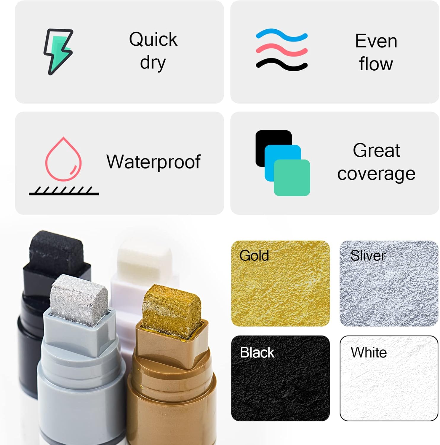 Paint Markers White/Black/Gold/Silver, 4Pcs Jumbo Acrylic Paint Markers Fat Wide Nibs 15mm, Acrylic Paint Pens for Stone, Metal, Wood, Glass, Canvas, Posters Supplies
