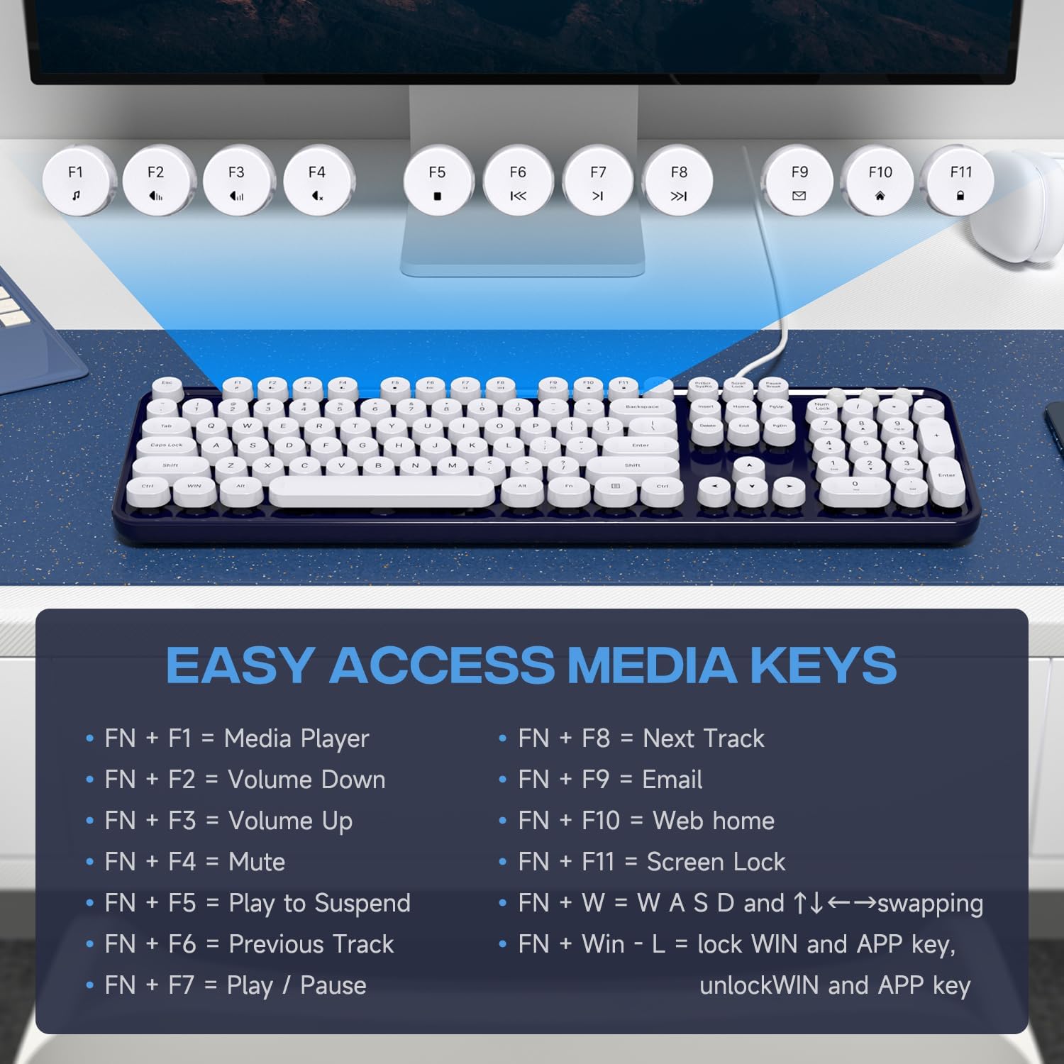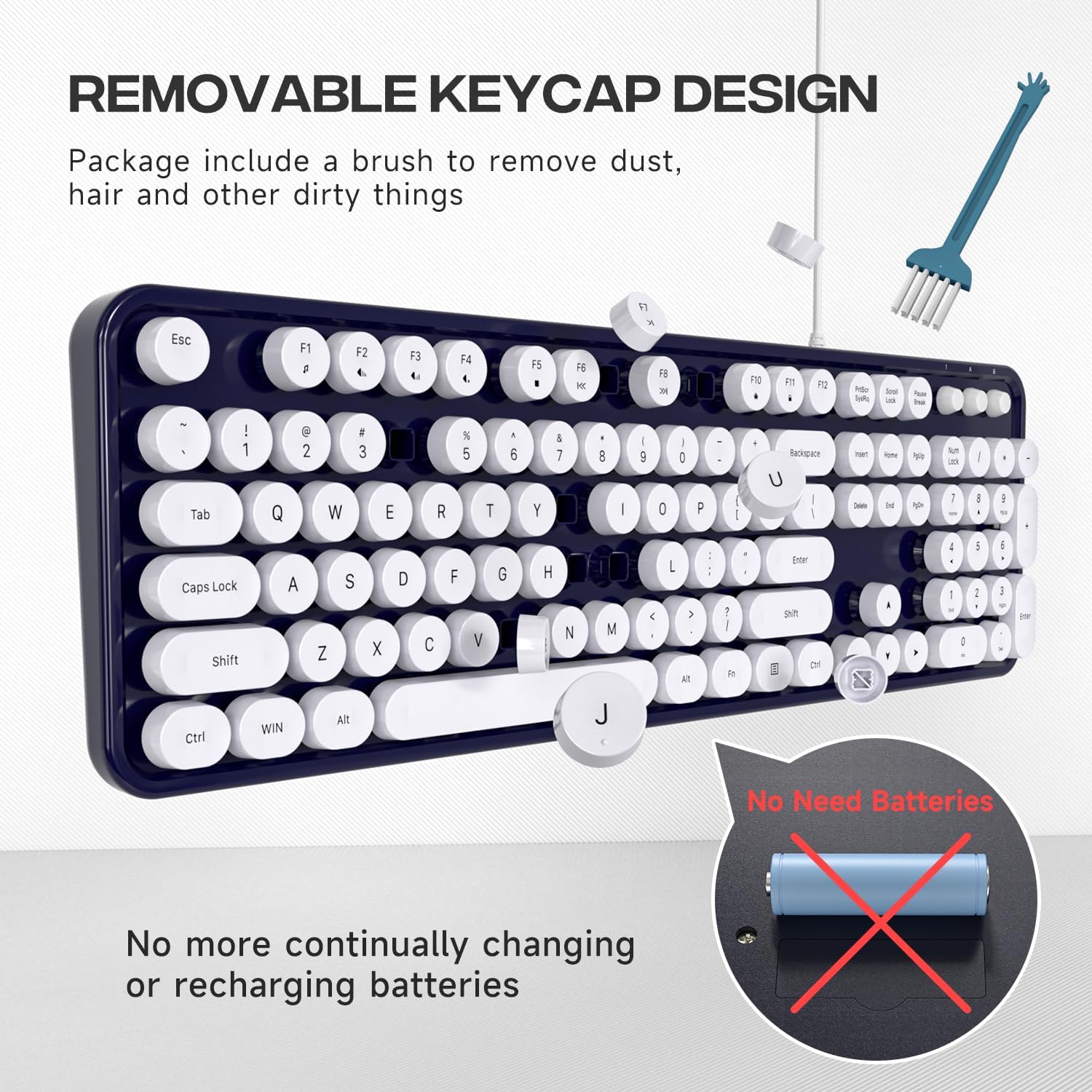 - ăRetro Wired KeyboardăCute round keycaps, crisp and sweet sound, perfect knocking feel, let you find the feeling of a retro typewriter.