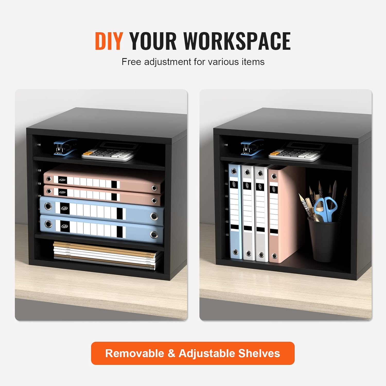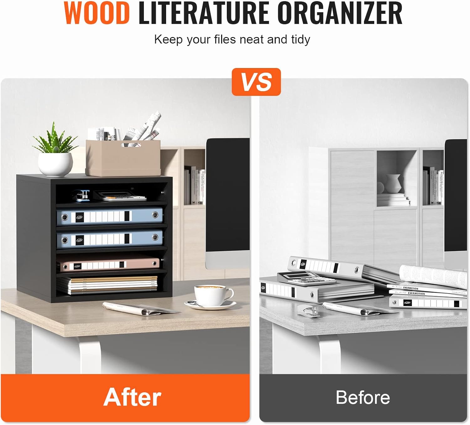 - Maximize Your Space: Say goodbye to cluttered desktops with VEVOR 13.9''x12''x13'' wood literature organizer. It has 5 compartments in total. You'll have ample space to store and organize books, documents, magazines, papers, and other materials. Keep your workspace neat and tidy with ease.