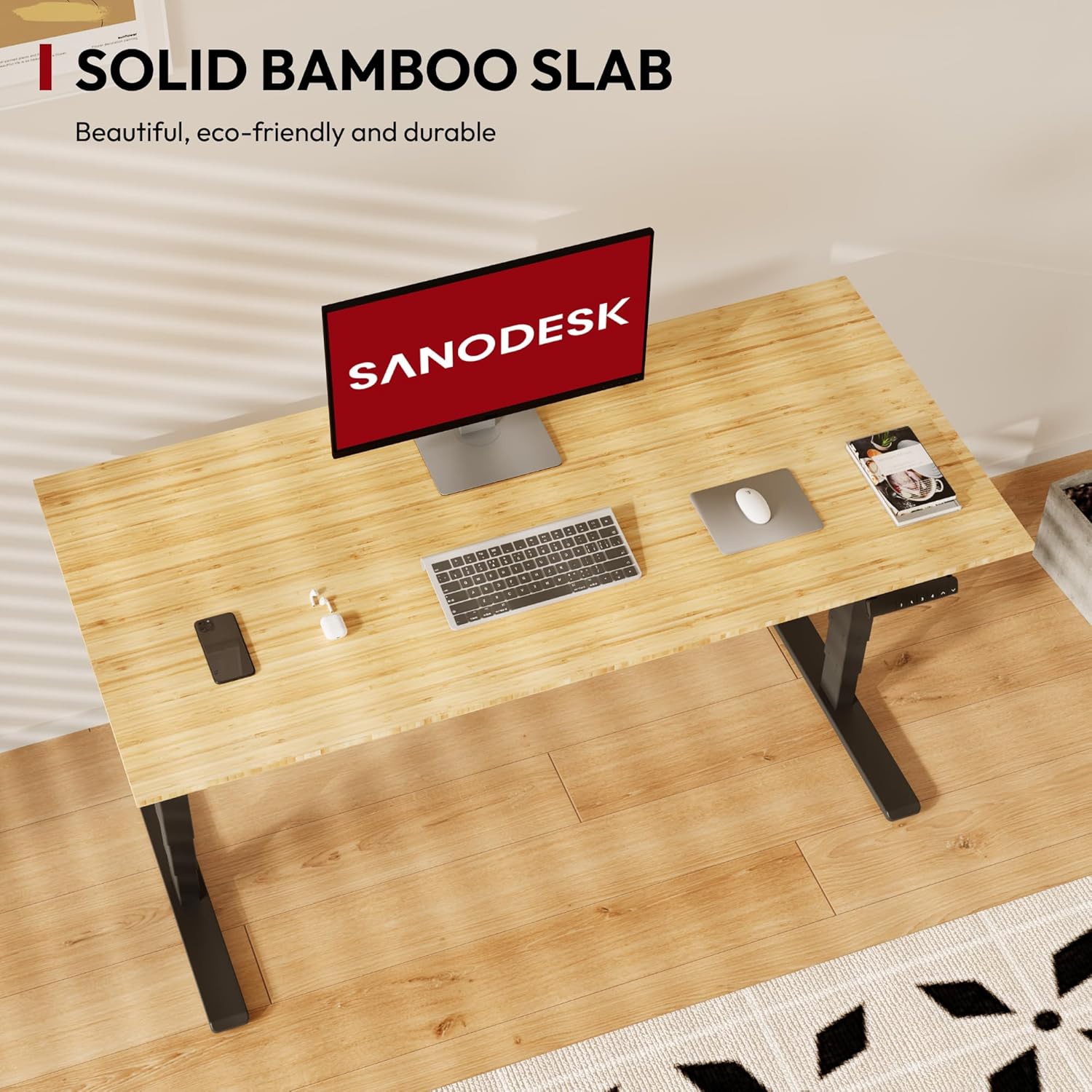 Standing Desk with Dual Motor, 3-Stage Lifting Column, Handset with 3 Preset and Sit-Stand Reminder - 60 inch Whole Piece Real Bamboo/Black Frame, Height Adjustable Desk for Home and Office