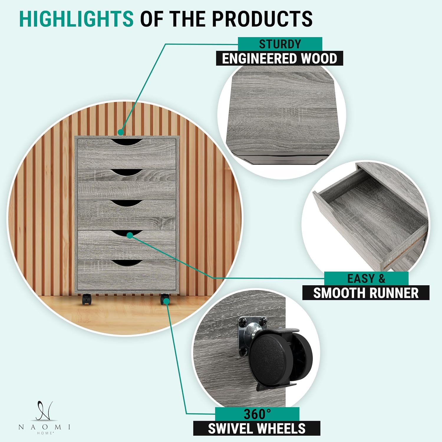 - PORTABLE FILE CABINETS FOR HOME OFFICE: Naomi’s rolling file cabinet is easy to move with 5 rolling wheels. The office organization filing cabinet is built with 360° wheels giving you easy access to move around. The wheels can also be locked for a steady place. Our office storage cabinet is compact in size with the dimension - 16"D x 16"W x 26"H