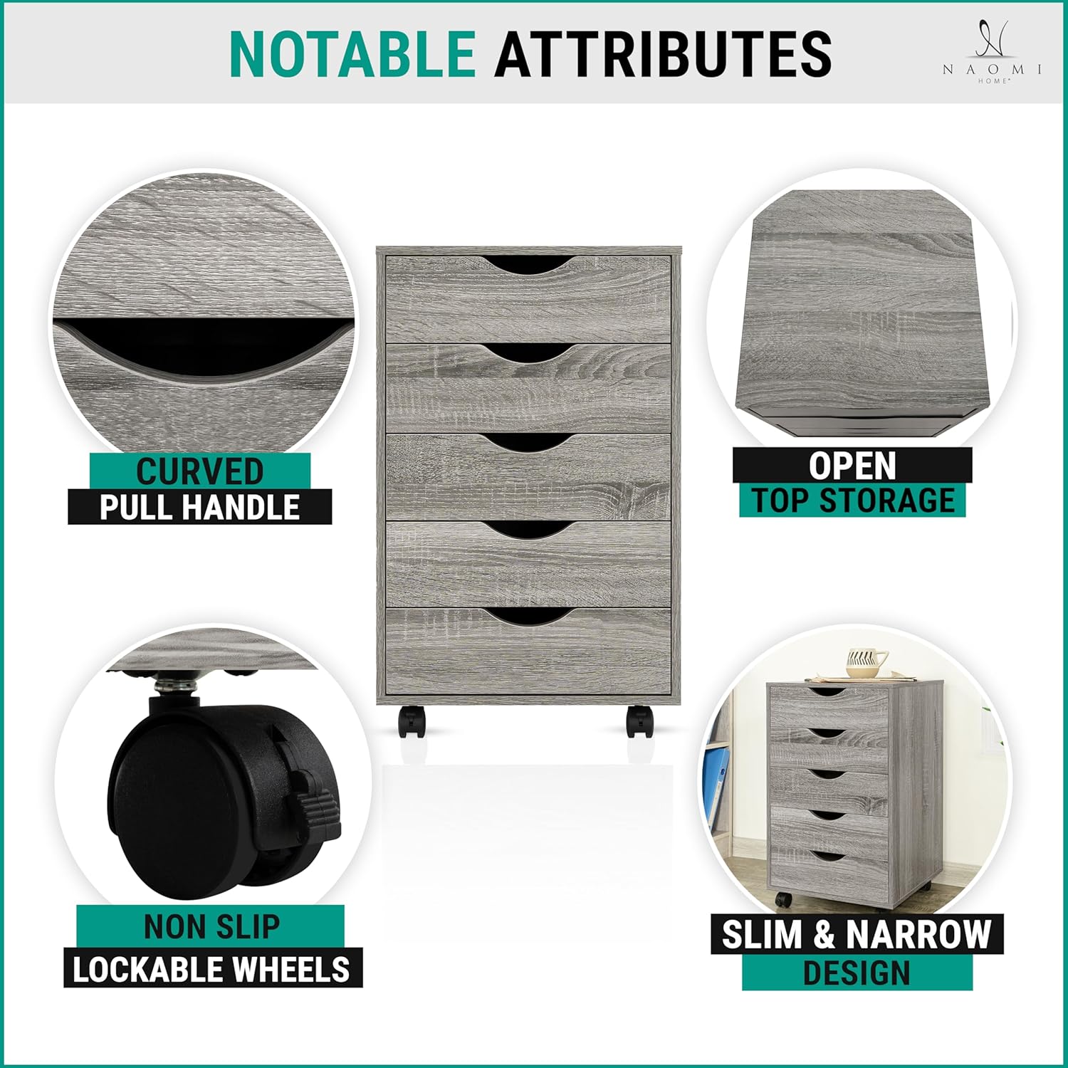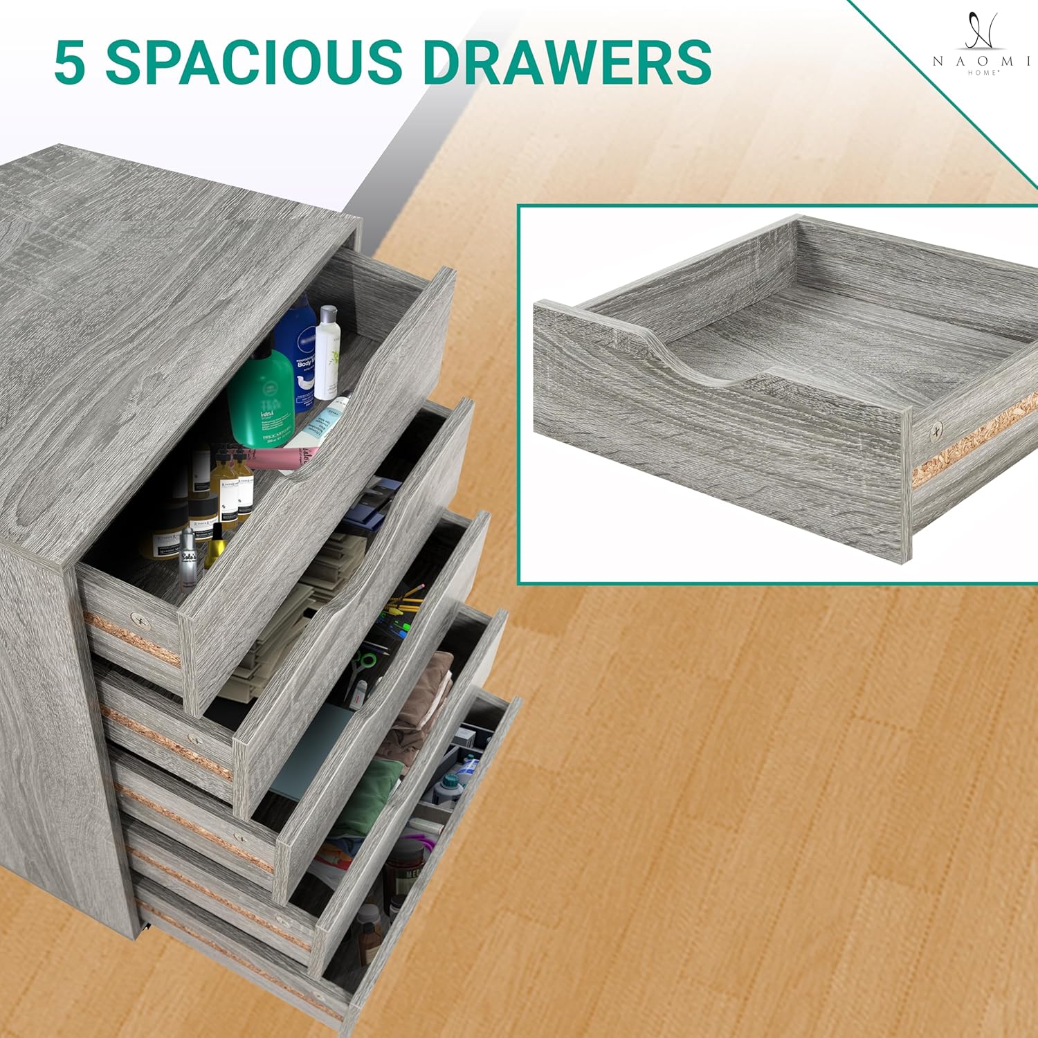 Naomi Home 5 Drawer Office Storage File Cabinet, Under Desk Cabinets for Organization Filing Cabinet with Wheels, Printer Stand Storage, 180 lbs Capacity - Gray Oak 11394AM