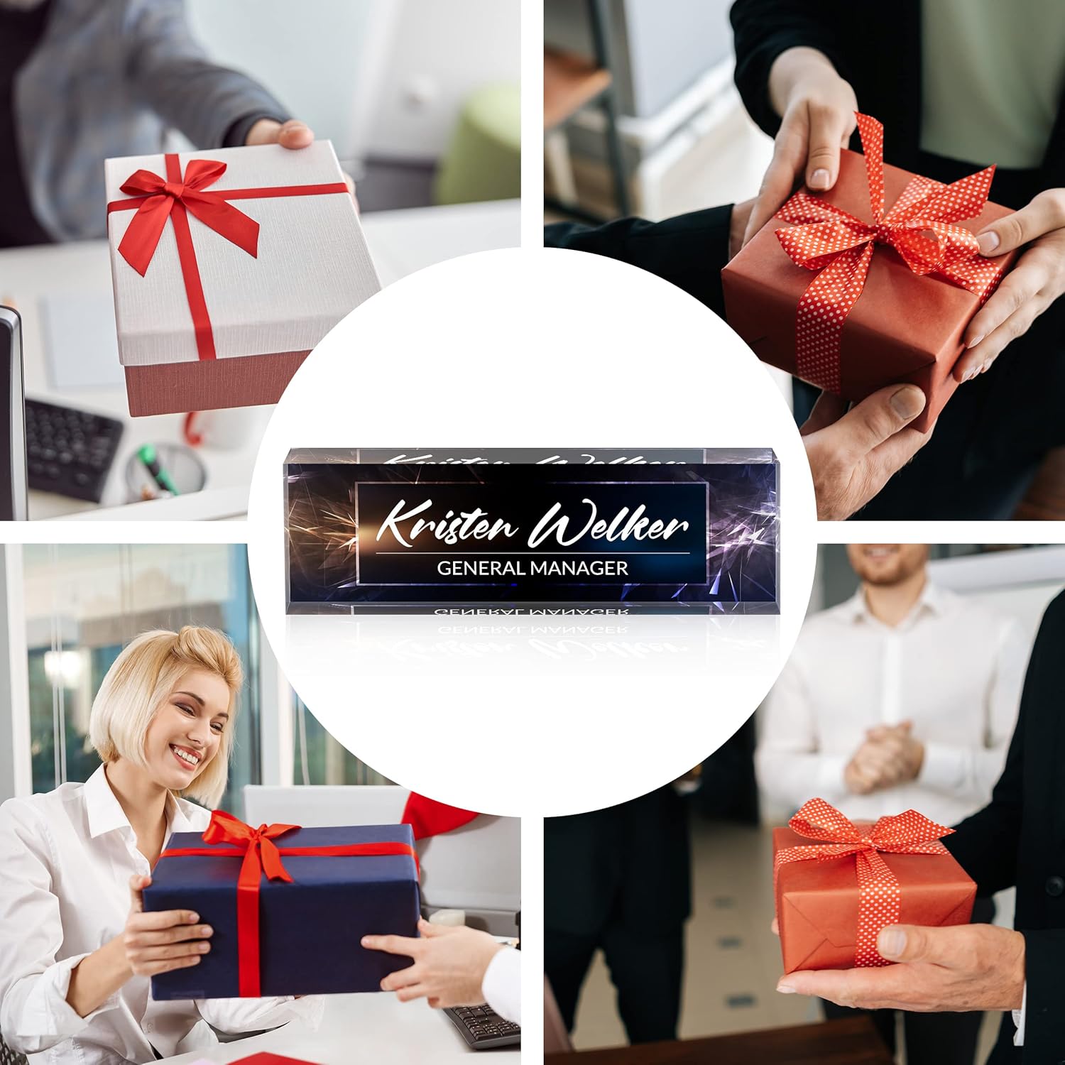 - šCustom A Great Office Decor Gift: Whether for holiday, birthday or work anniversaries, DIY a unique name plate for them, this premium acrylic glass block name plate will impress! Let your coworkers know you appreciate them.
