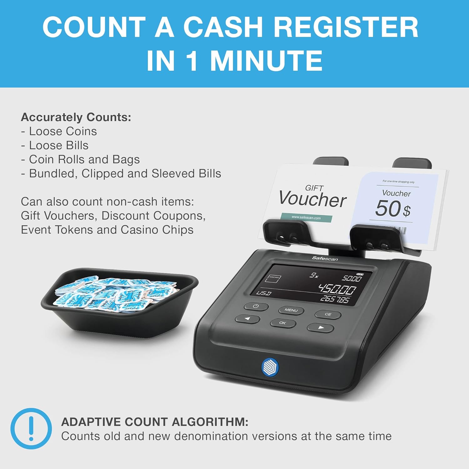 - VERSATILE: The Safescan 6175 Advanced Money Counting Scale can easily count bills or coins, add in credit card or check payments, utilize reference numbers and time stamps, deduct the day's starting cash from the total and more