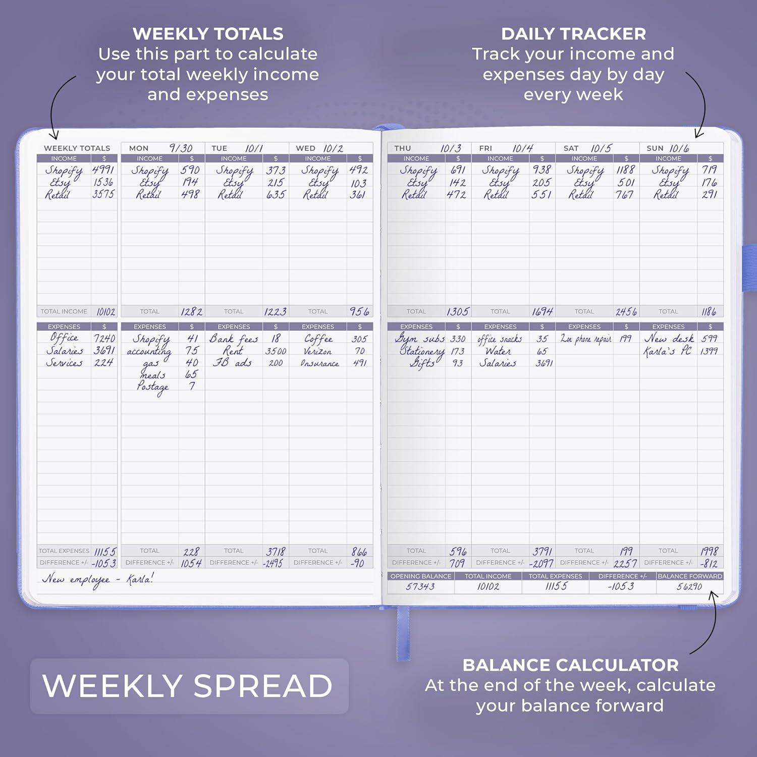 - 2 FULL YEARS OF STRESS-FREE ACCOUNTING: This accounting book is undated and lasts 2 years and has 225 pages, including 106 weekly views, 2 annual summaries, empty note pages, and, at the back, a spacious pocket for receipts.