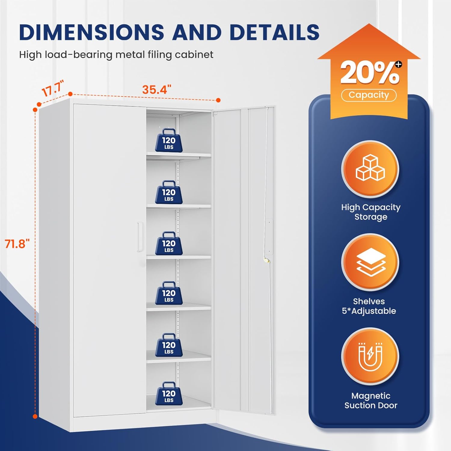 Yizosh Metal Storage Cabinet with Locking Doors and 5 Adjustable Shelves,- 72" Garage Storage White Steel Lockable File Cabinet for Office,Home,Garage