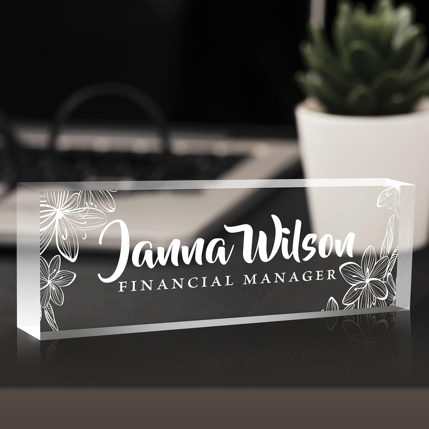 - šPremium Quality: The personalized name sign plates are made of high quality crystal clear acrylic blocks. This office nameplate will stand out on any desk! We use high-tech uv printers to print on quality clear acrylics glass so you can visualise your memories.