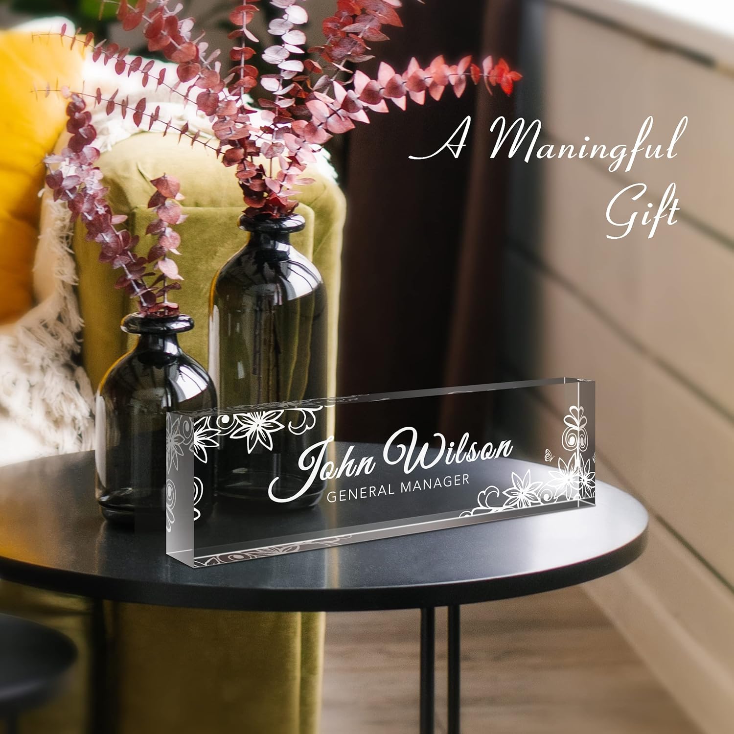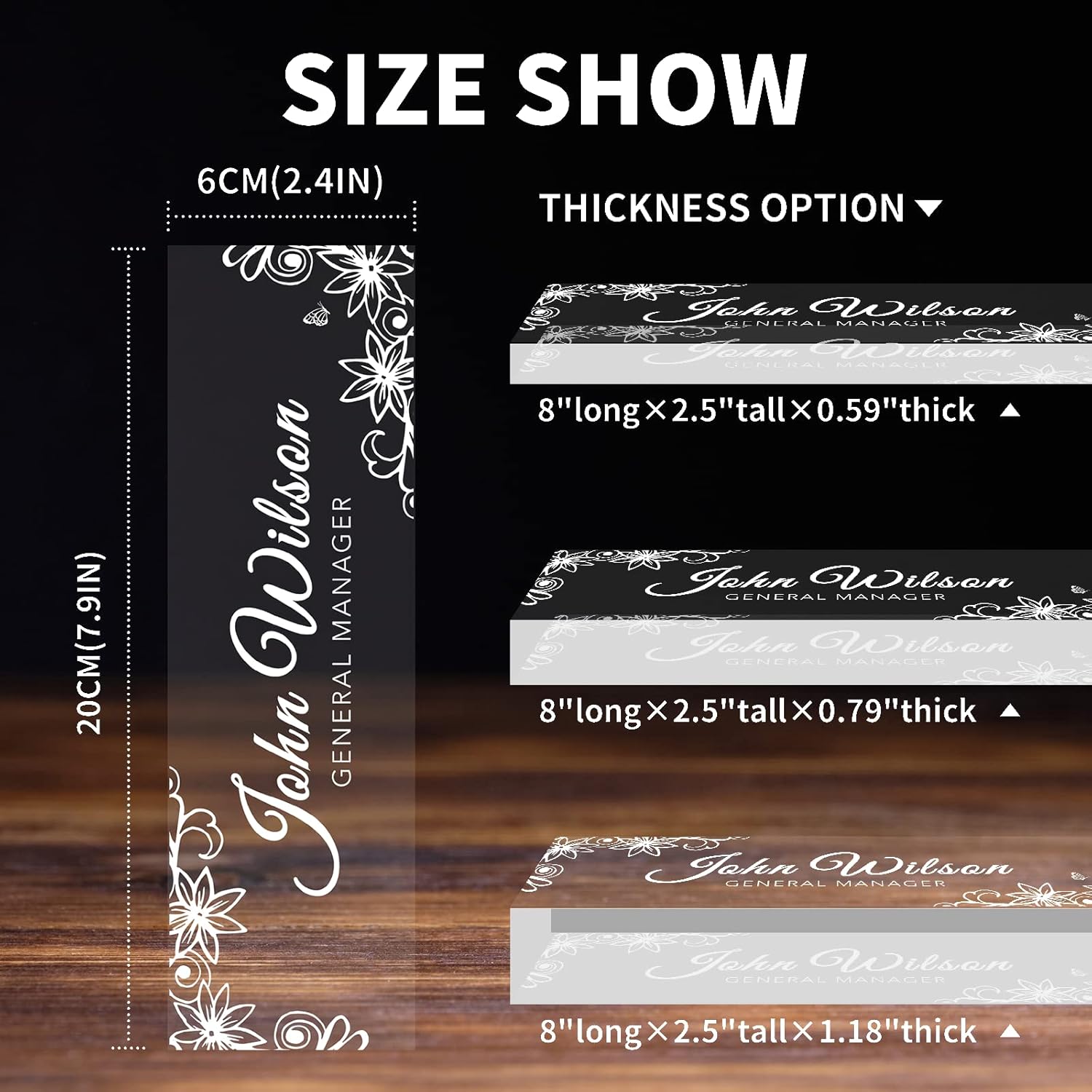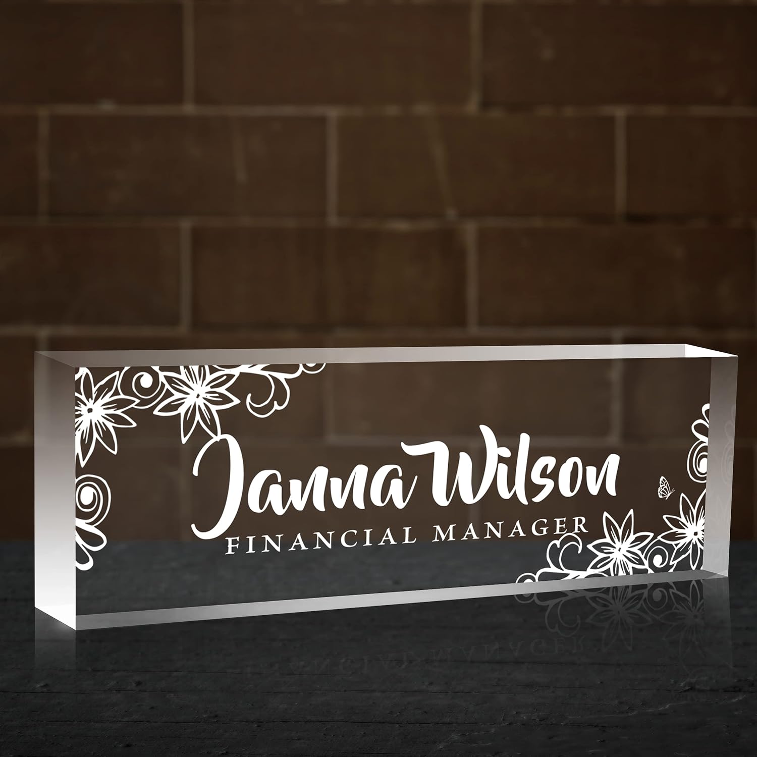 - šPremium Quality: The personalized name sign plates are made of high quality crystal clear acrylic blocks. This office nameplate will stand out on any desk! We use high-tech uv printers to print on quality clear acrylics glass so you can visualise your memories.