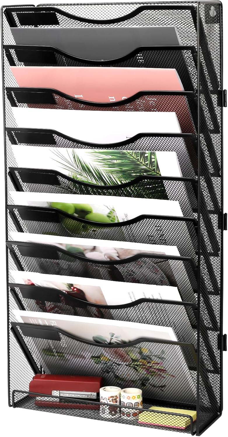 - 9+1 Tier Oversized Capacity: Wall mounted file organizer with 10 pockets stores 9 folders + accessories. Flat tray holds mail, bills, magazines. Includes white labels for instant office/home categorization.