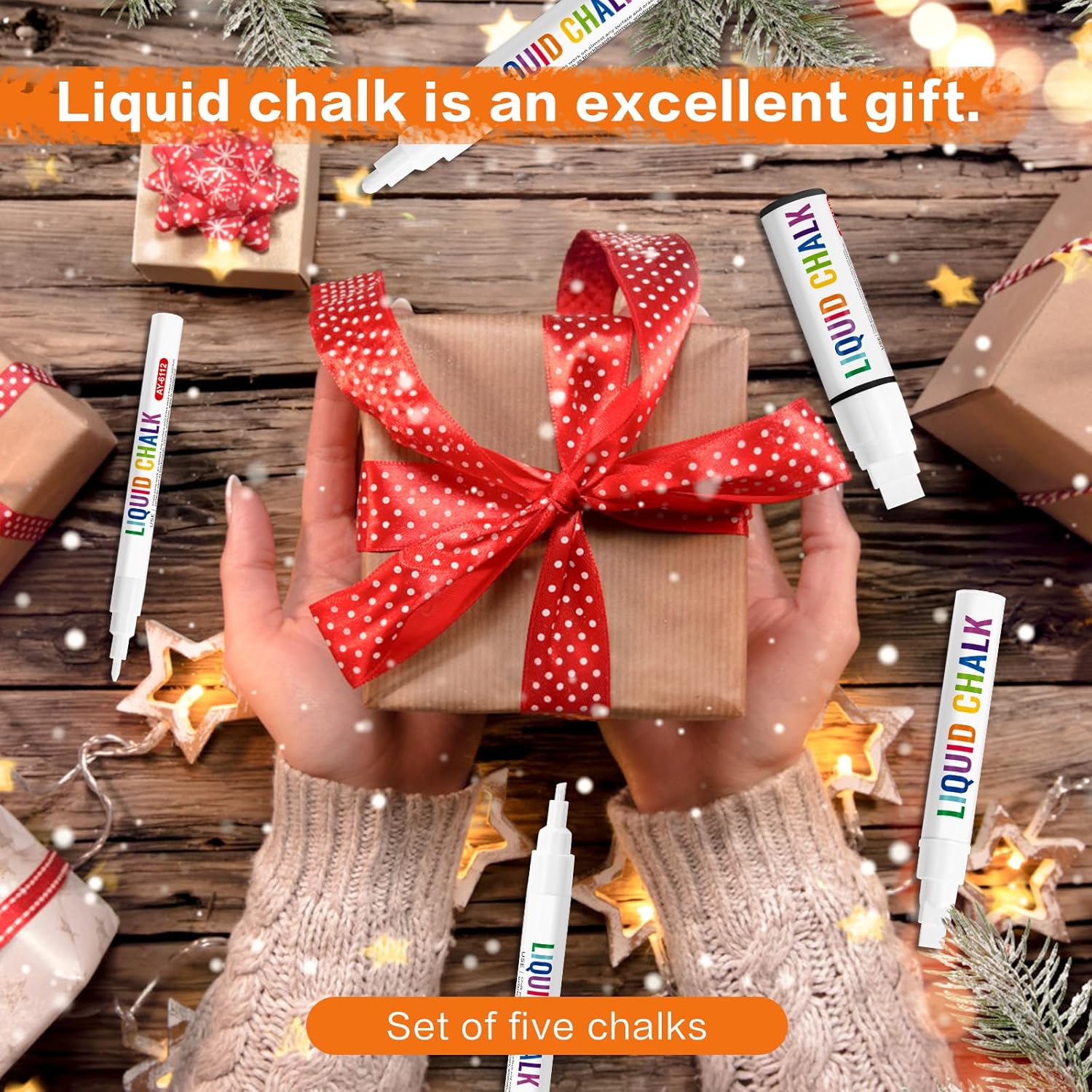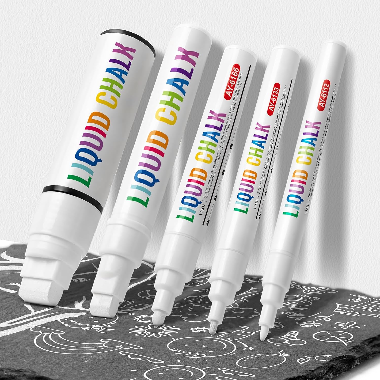 White Chalk Markers For Chalkboard, Liquid Chalk Markers Erasable 5 Variety Pack - 1mm Ultra Fine Tip, 3mm Fine Tip, 6mm Medium, 10mm Bold, 15mm Jumbo For Blackboard, Car Window, Signs, Glass, Bistro