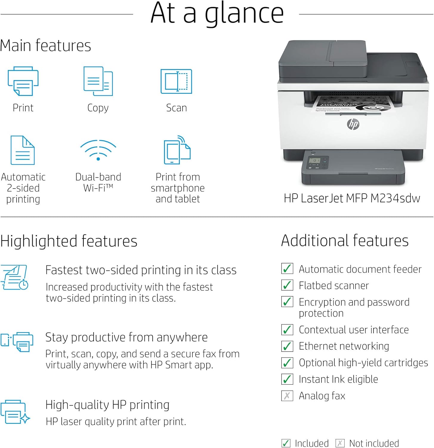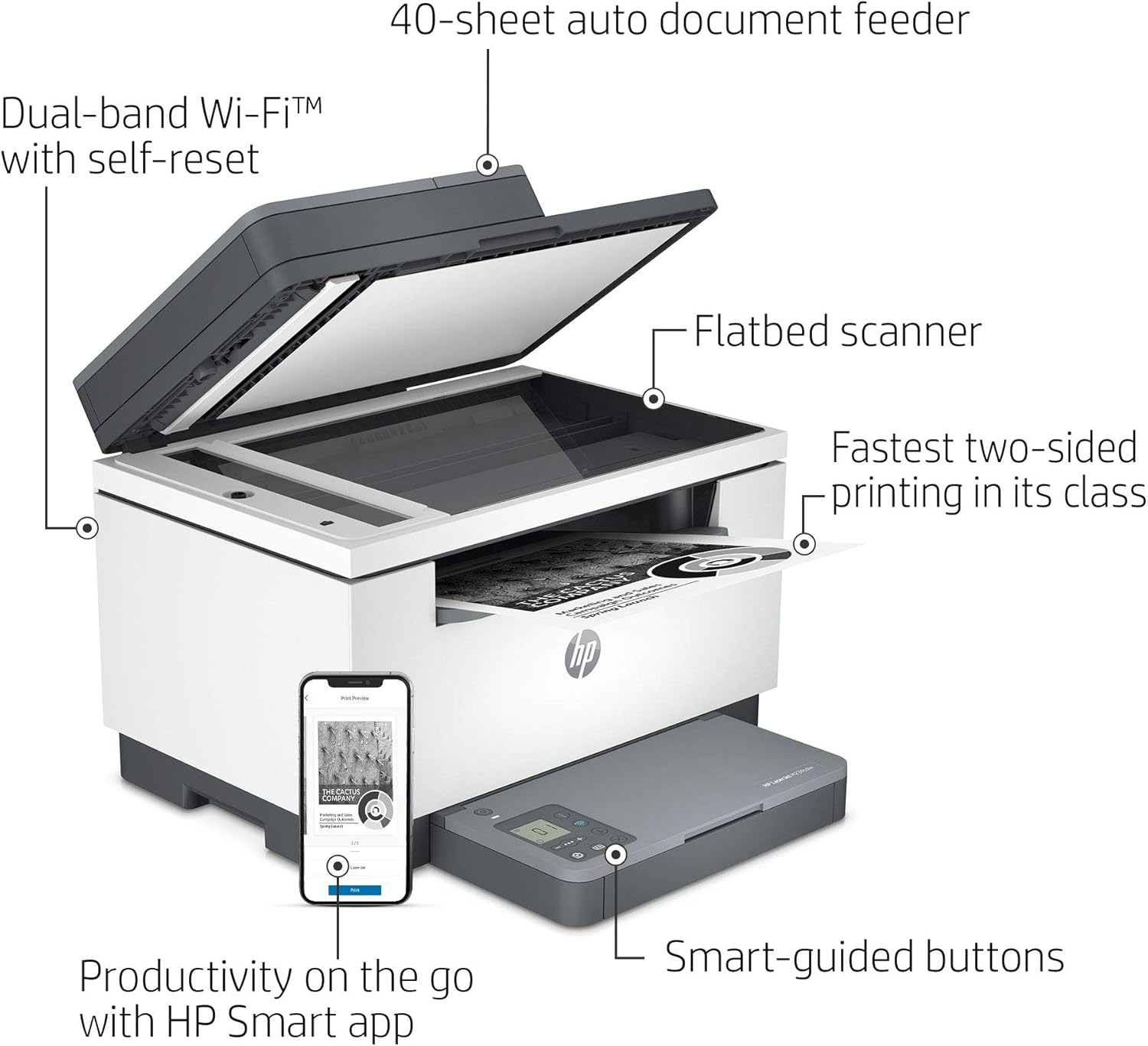 - FASTEST TWO-SIDED PRINTING IN ITS CLASS – Black & white precision laser printing plus scan, copy, an auto document feeder and wireless connectivity