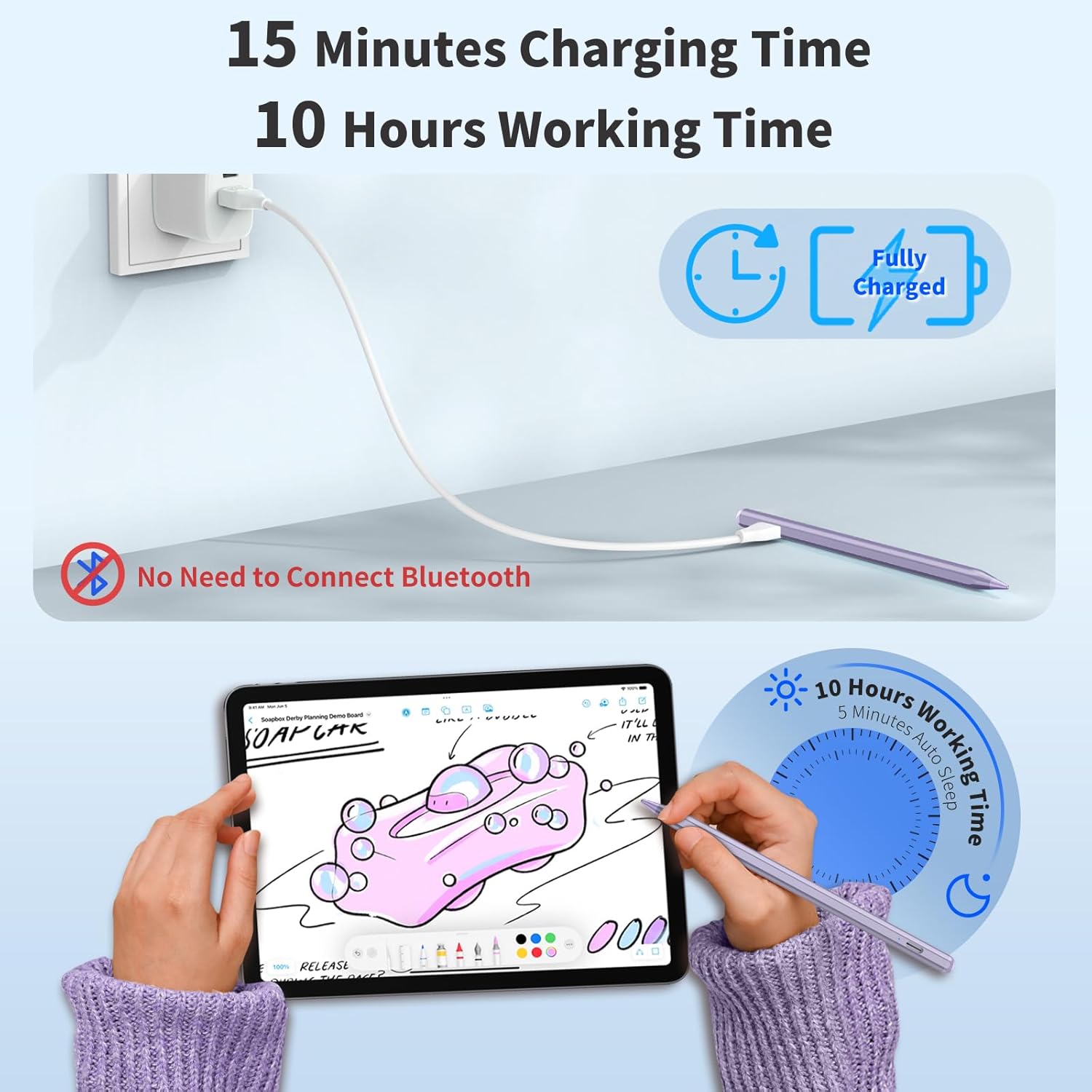- ✅Fast Charging and Long Standby: This stylus pen support 10 hours of continuous use and 180 days long term standby for only 15 Minutes per charging. Don’t need to turn off it by hand, it will auto-fall asleep after idle for 5 minutes to save power