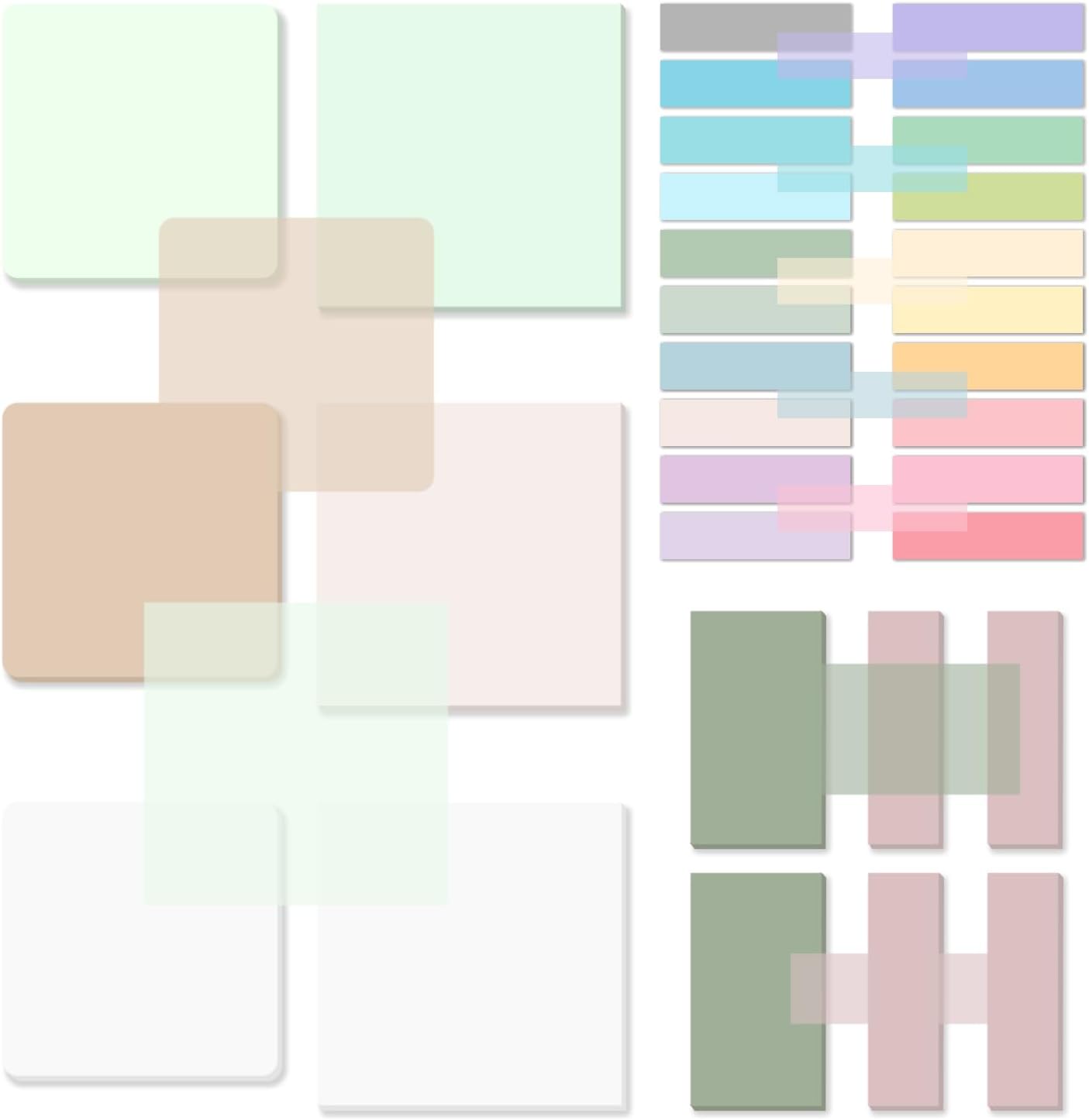 - What Will You Get: 300 Sheets transparent sticky notes( 3x3 inch ), 100 Sheets green translucent sticky notes(2.3x1.45 inch), 200 Sheets pink translucent sticky notes(2.3x0.7 inch), 400 Sheets morandi pastel different colors book tabs(1.8x0.4 inch), sufficient in quantity, enough to be used for a long time,Translucent sticky notes meet your various note-taking needs.