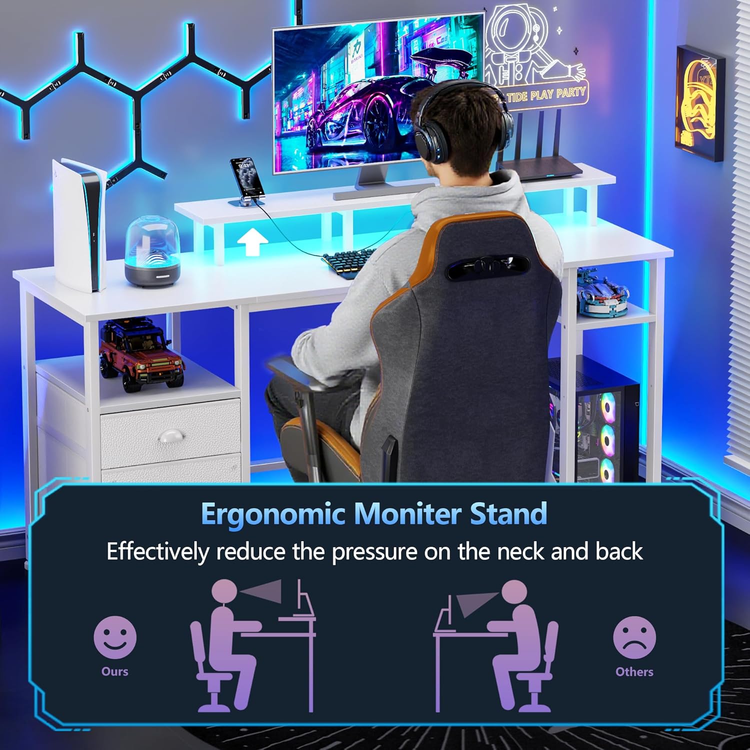 Furologee 61" Computer Desk with Power Outlet and LED Lights, Reversible Gaming Desk with File Cabinet & Monitor Stand for Home Office, Large Work Table with Storage Shelves & Drawer, White