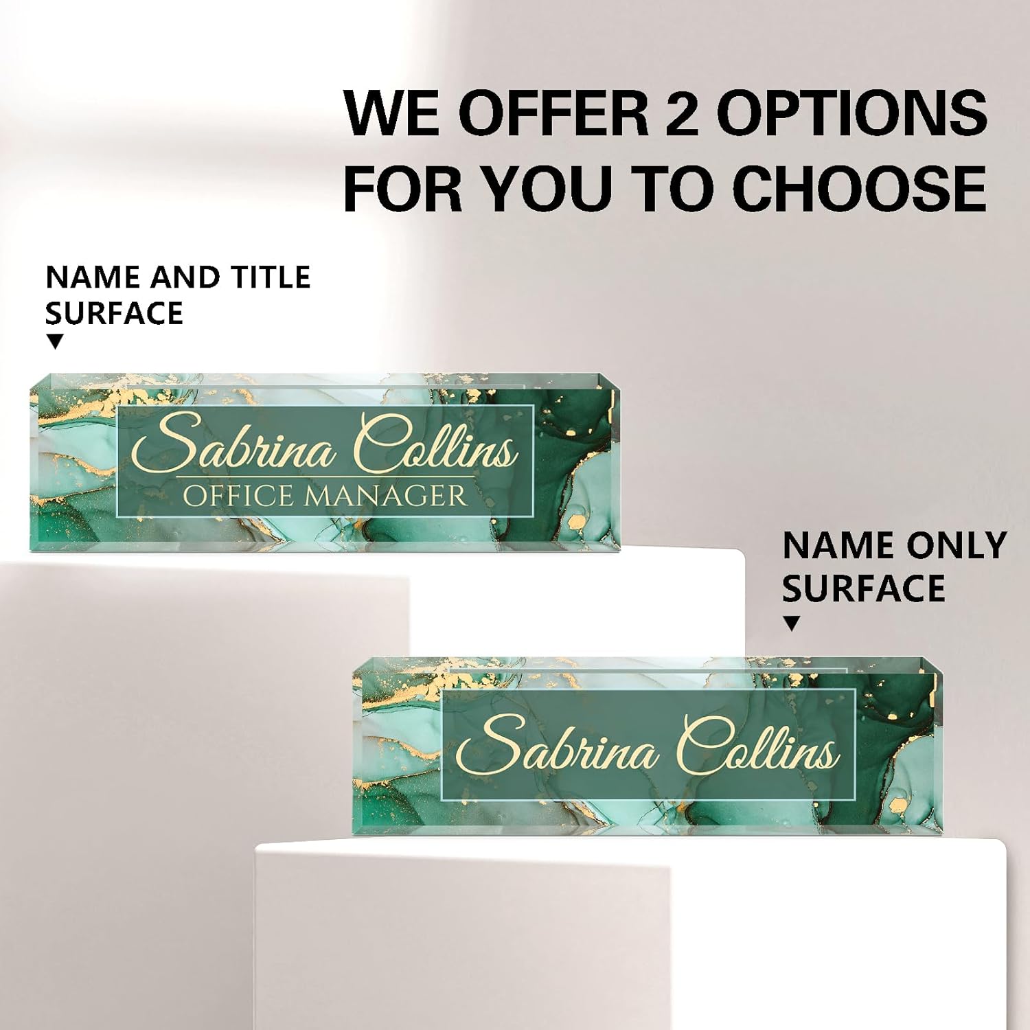 - ✨Personalized Acrylic Desk Name Plate: It's very easy to customize, you only need to choose your favorite design style, and then enter your name/title/company name/good wishes, whatever you want to display. But make sure to enter your custom text the way you want it (uppercase vs. lowercase, full title vs. abbreviation, etc.). Please make sure you write it correctly, we have professional designers to design it, you will be amazed how professional your finished nameplate looks!