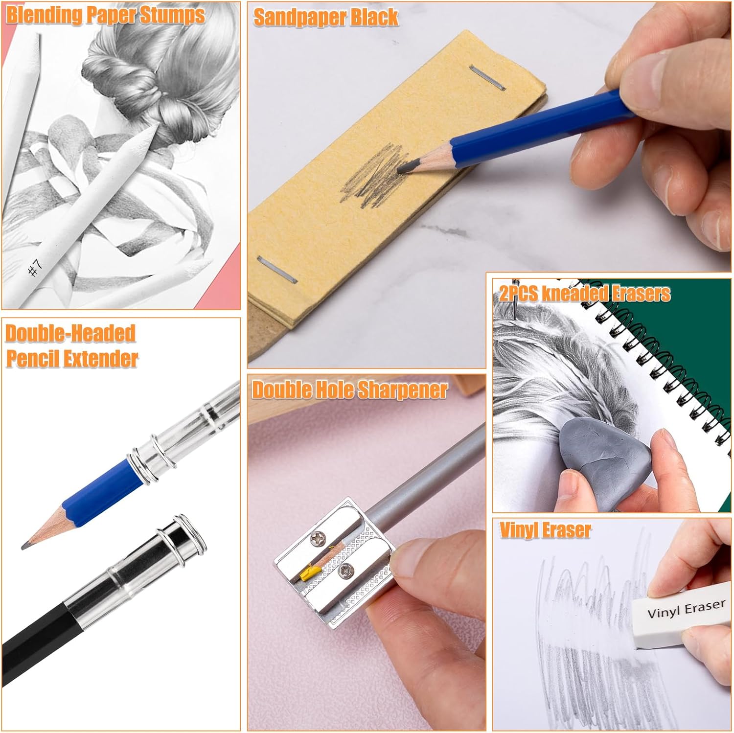 - 【Professional and Complete Drawing Sketching Set】 Drawdart's 76 pack art supplies kit is perfect for both beginners and professionals with its comprehensive collection of high-quality drawing tools. This set comes with various pencils, blending tools, erasers, sharpeners, and more, providing everything you need to unleash your artistic talent. These drawing pencils include 3 White Charcoal Pencils, 6 Black Charcoal Pencils, 2 Colored Charcoal Pencils, 12 Watercolor Pencils, 12 Oil Based Colored Pencils, 12 Wooden Graphite Sketching Pencils, 12 Metallic Coloring Pencils, 1 Woodless Graphite Pencil 6B. Perfect for drawing, sketching, shading, layering, blending, and more.